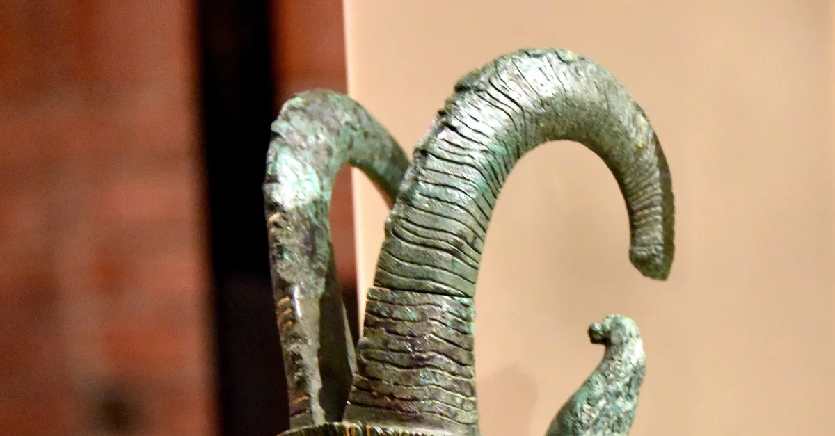 This bronze and gilded head of an Ibex or a capricorn was part of sacred bark which might be carried on the shoulders of a procession of priests during rituals. Probably from Zagazig, Egypt. Third Intermediate Period, 21st Dynasty, 1069-945 BCE. It is on display at the Neues Museum, Berlin, Germany.