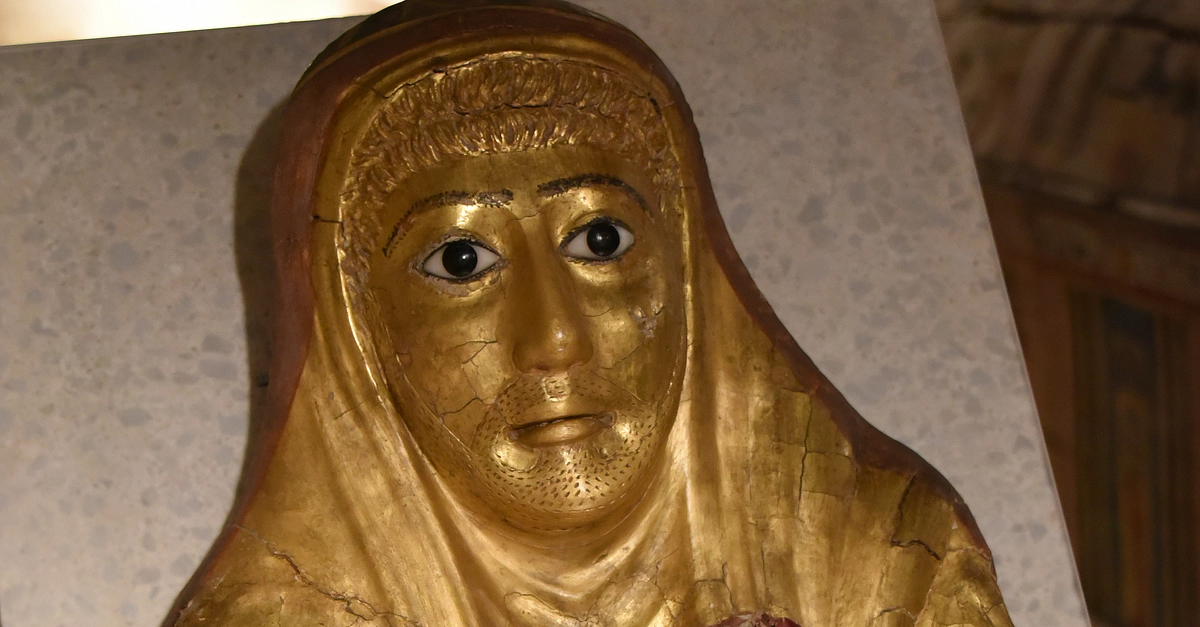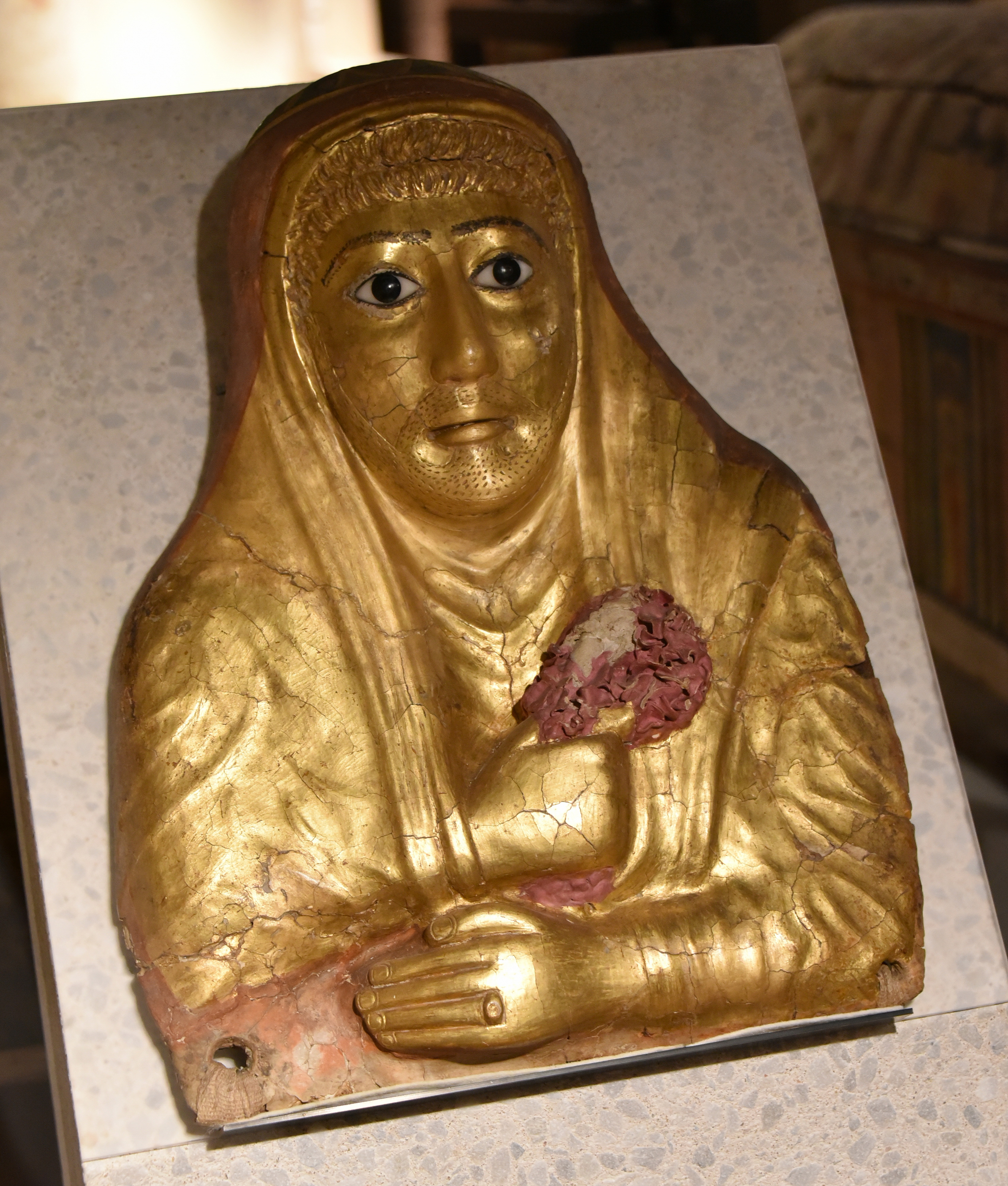 This is a mummy mask of Aline's husband. His right hand grasps what appears to be a wreath or garland of rose petals. His arms are wrapped in a toga. The eyebrows are painted (not made of glass) while the eyeballs are made of white and black stones. The eyelashes were made of carefully cut bronze. He is bearded, and the facial expression and hand gestures reflect a humble appearance. Stucco on canvas, gilded. From the tomb of Aline at Hawara, Faiyum, Egypt. Early Roman period of Egypt, c. 24 CE. It is on display at the Neues Museum, Berlin, Germany. The tomb of Aline was unearthed in 1892 CE by the German archaeologist Richard von Kaufmann (1850 - 1908 CE). A hewn stele carved with a Greek inscription mentions the name Aline as the owner of the tomb; the grave was named after this woman's name.