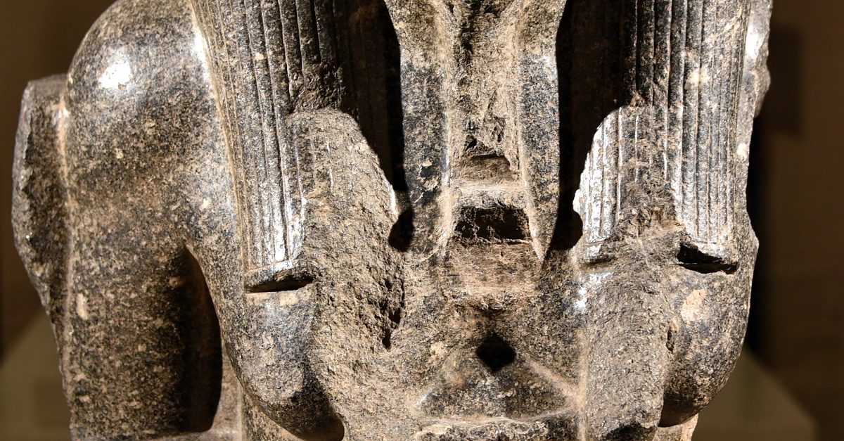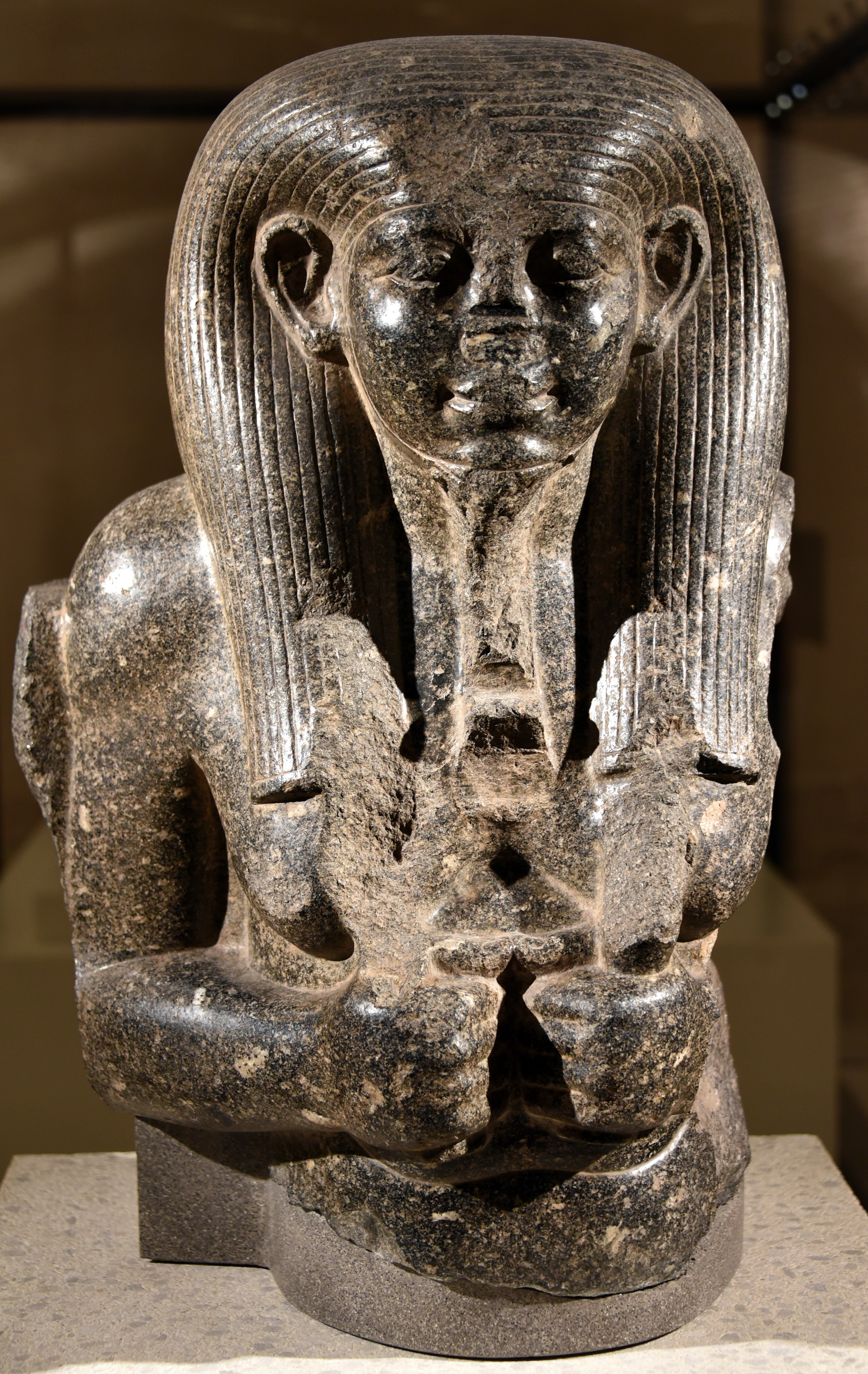 This is the upper part of the statue of the Nile God Hapy (also rendered as Hapi). Black granite. From Faiyum, Egypt. Middle Kingdom, 12th Dynasty, c. 1800 BCE. It is on display at the Neues Museum, Berlin, Germany.