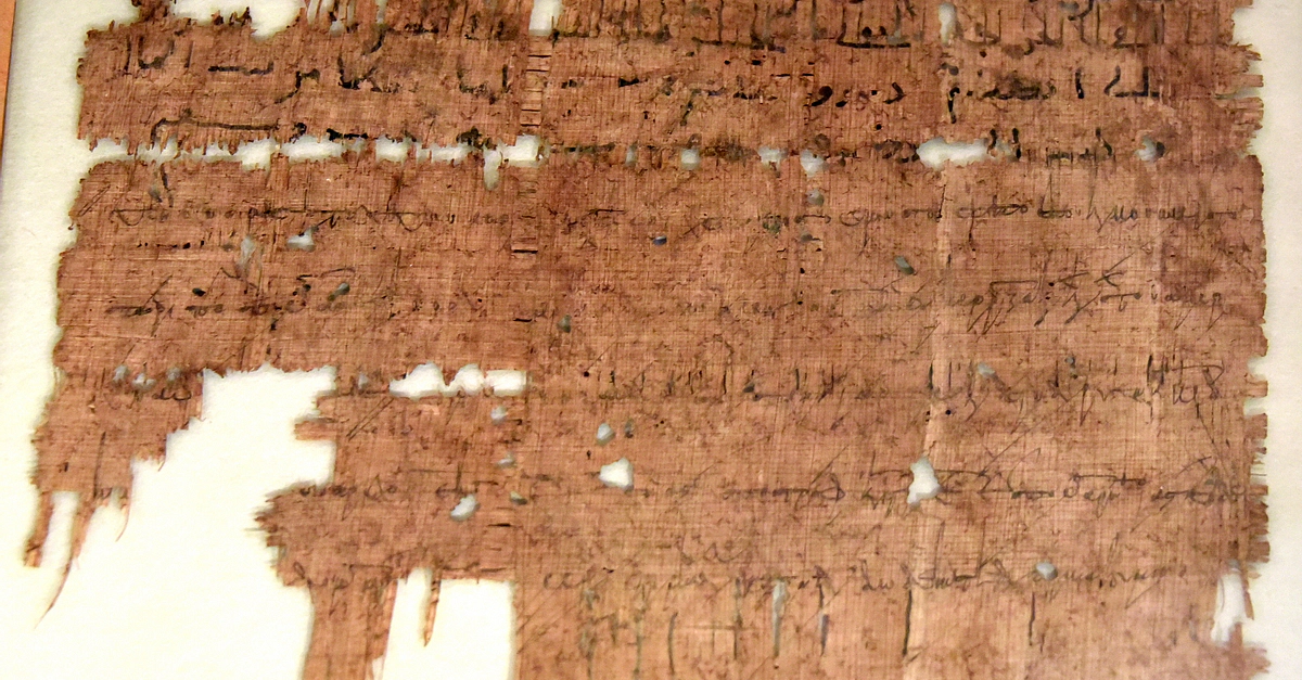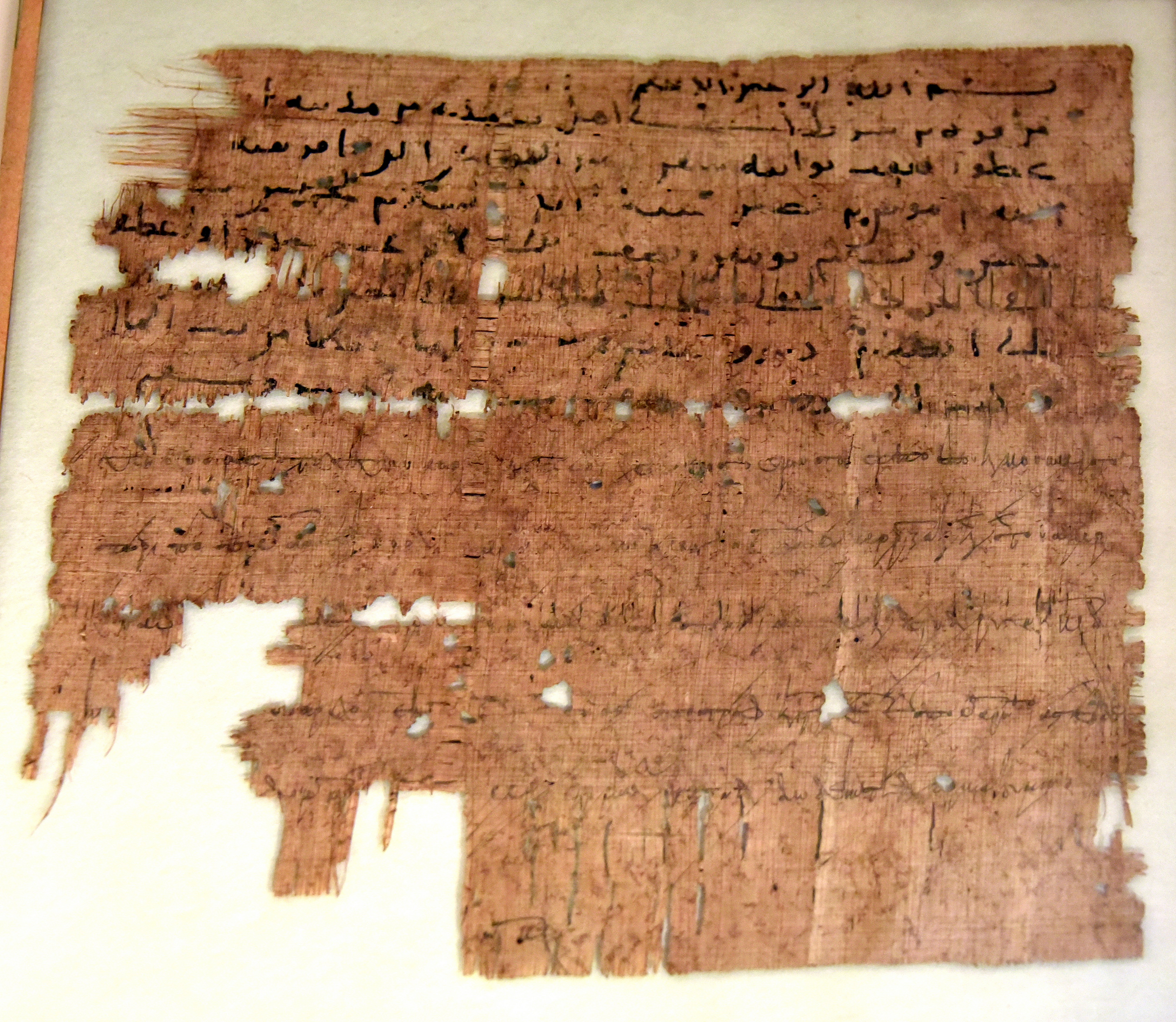 This piece of papyrus is written using both Arabic and Greek languages about an edict of the governor of Egypt. The date is November 22, 713 CE. From Egypt, precise provenance is unknown. (The Neues Museum, Berlin, Germany).