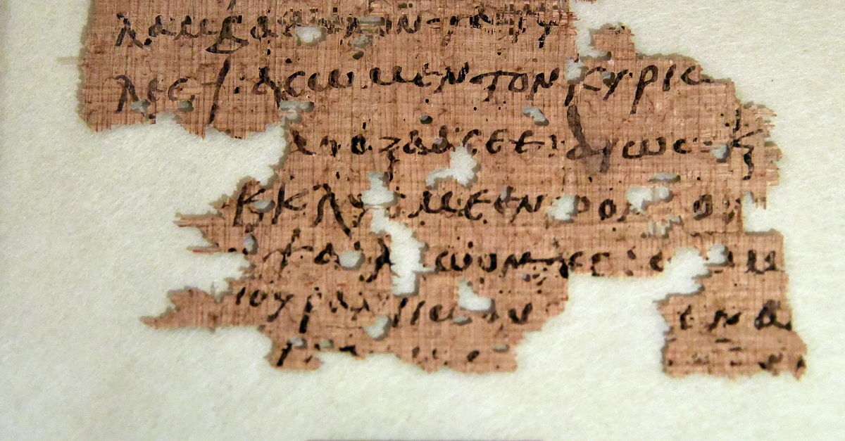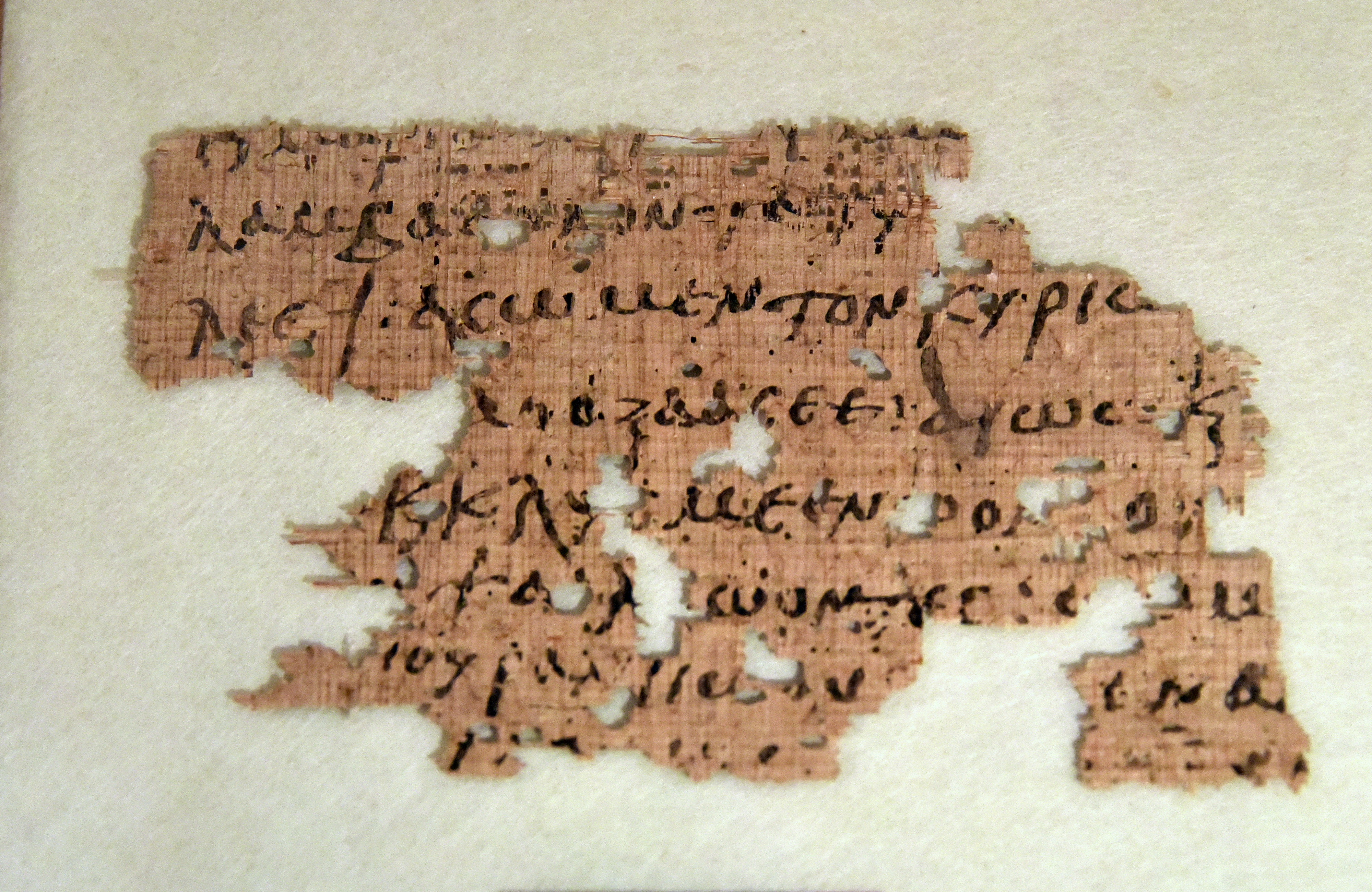 This is the recto of a double hymn, written on papyrus, with double vowels for musical purposes. This one mentions the Baptism of Jesus in Jordan. The order of the words follows the gospel of John. From Egypt, precise provenance is unknown. Byzantine period, 5th to 6th century CE. It is on display at the Neues Museum in Berlin, Germany.