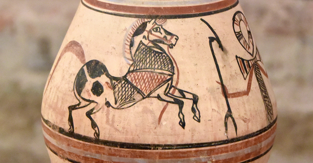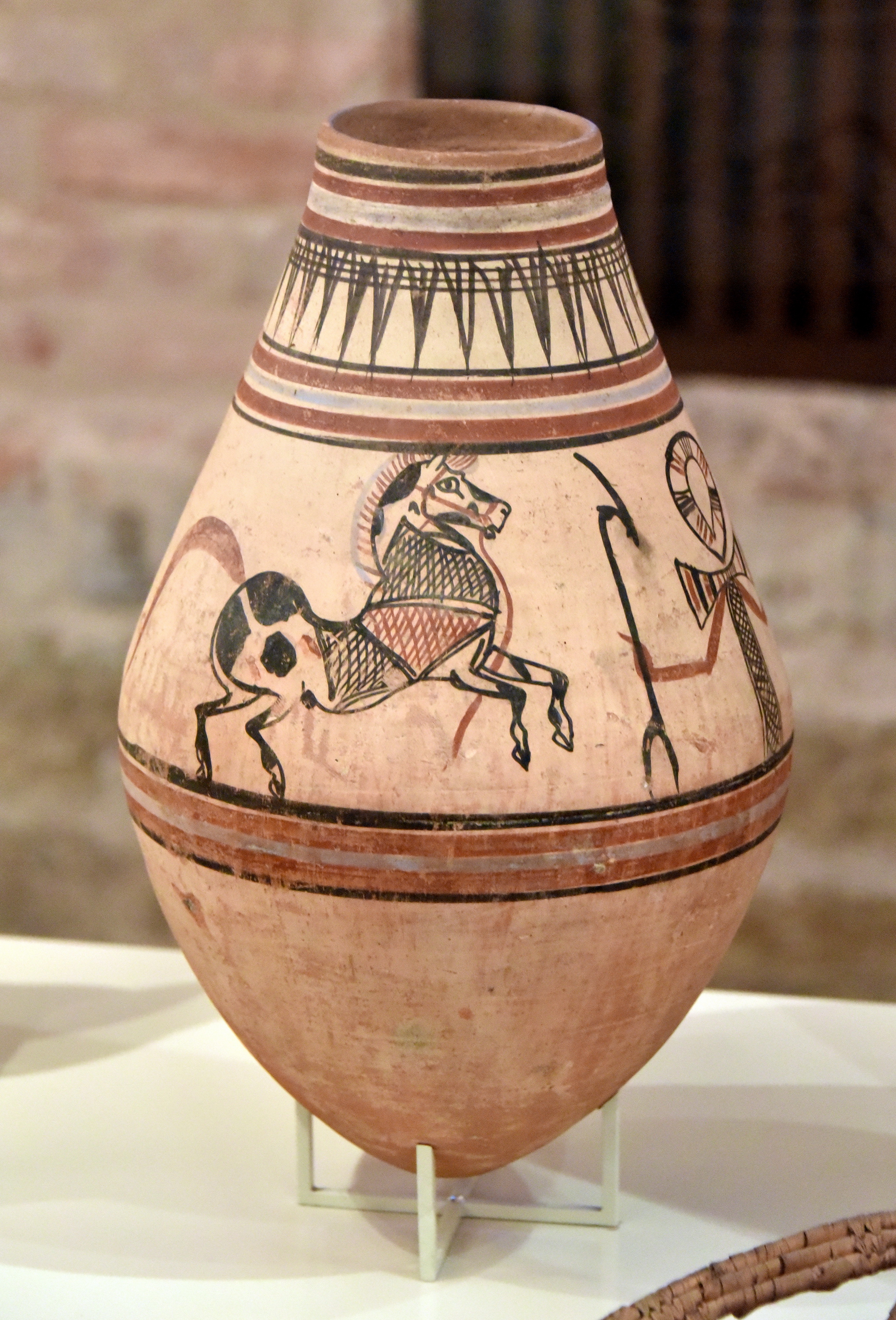 On this ceramic vessel, two piebald horses are depicted; they are galloping and harnessed. An ankh sign's hand grasps a was-scepter. Horses were introduced to Egypt by the Hyksos during the Second Intermediate Period, c 1780 BCE. From Egypt, precise provenance is unknown. New Kingdom, 18th Dynasty, c. 1340 BCE. It is on display at the Neues Museum in Berlin.
