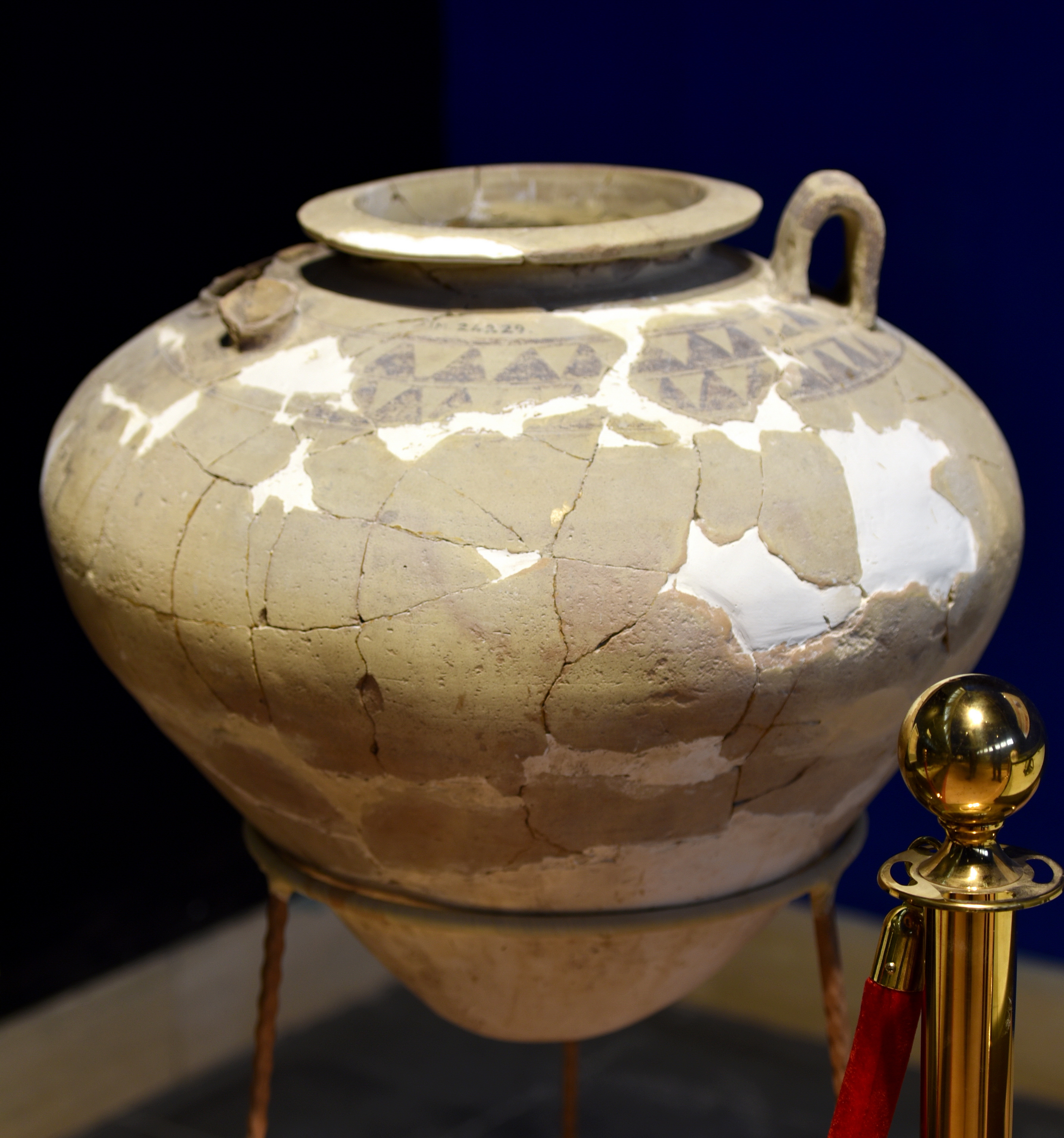 Large pear-shaped and single-handed jar. The rim is decorated with geometric motifs. From Tell Fara (ancient Sharuppak), southern Mesopotamia, Iraq. 5000-4000 BCE. On display at the Iraq Museum in Baghdad.