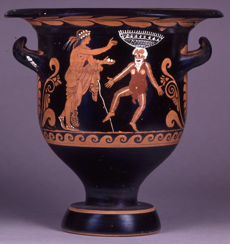 A red-figure bell-krater from Paestum 360-340 BCE. In a scene from Greek comedy, Dionysos is depicted with a comic actor balancing a basket on his head. The actor is in typical costume - padded stomach, added phallus and bearded mask.