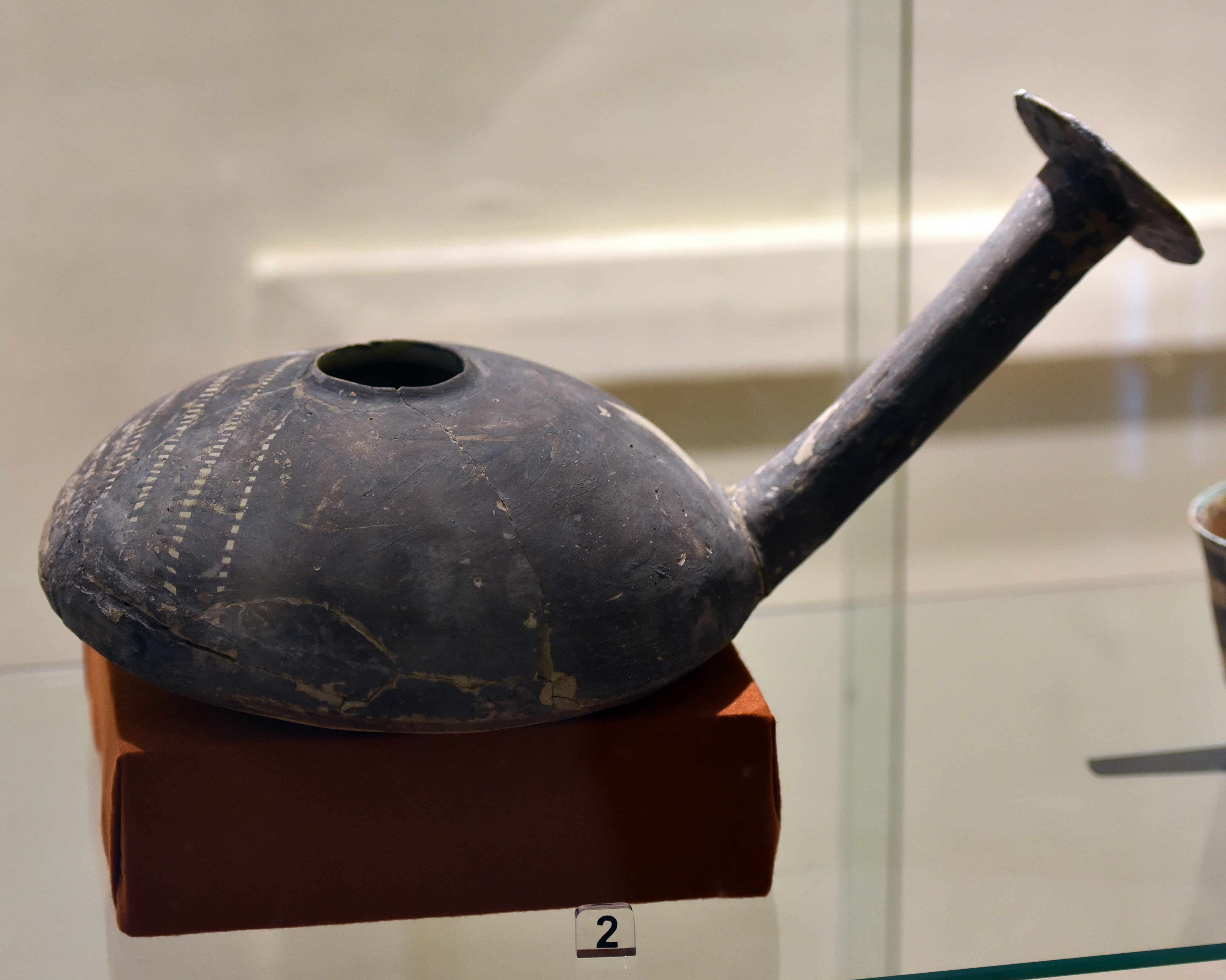This pottery jug or ewer is somewhat oval in shape and has a relatively long and straight spout. From Eridu (Tell Abu Shahrain), southern Mesopotamia, Iraq. 3500-2800 BCE. On display at the Iraq Museum in Baghdad.