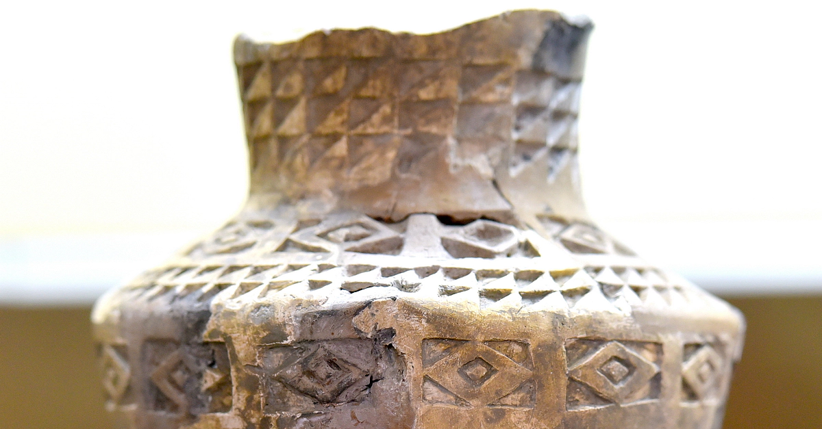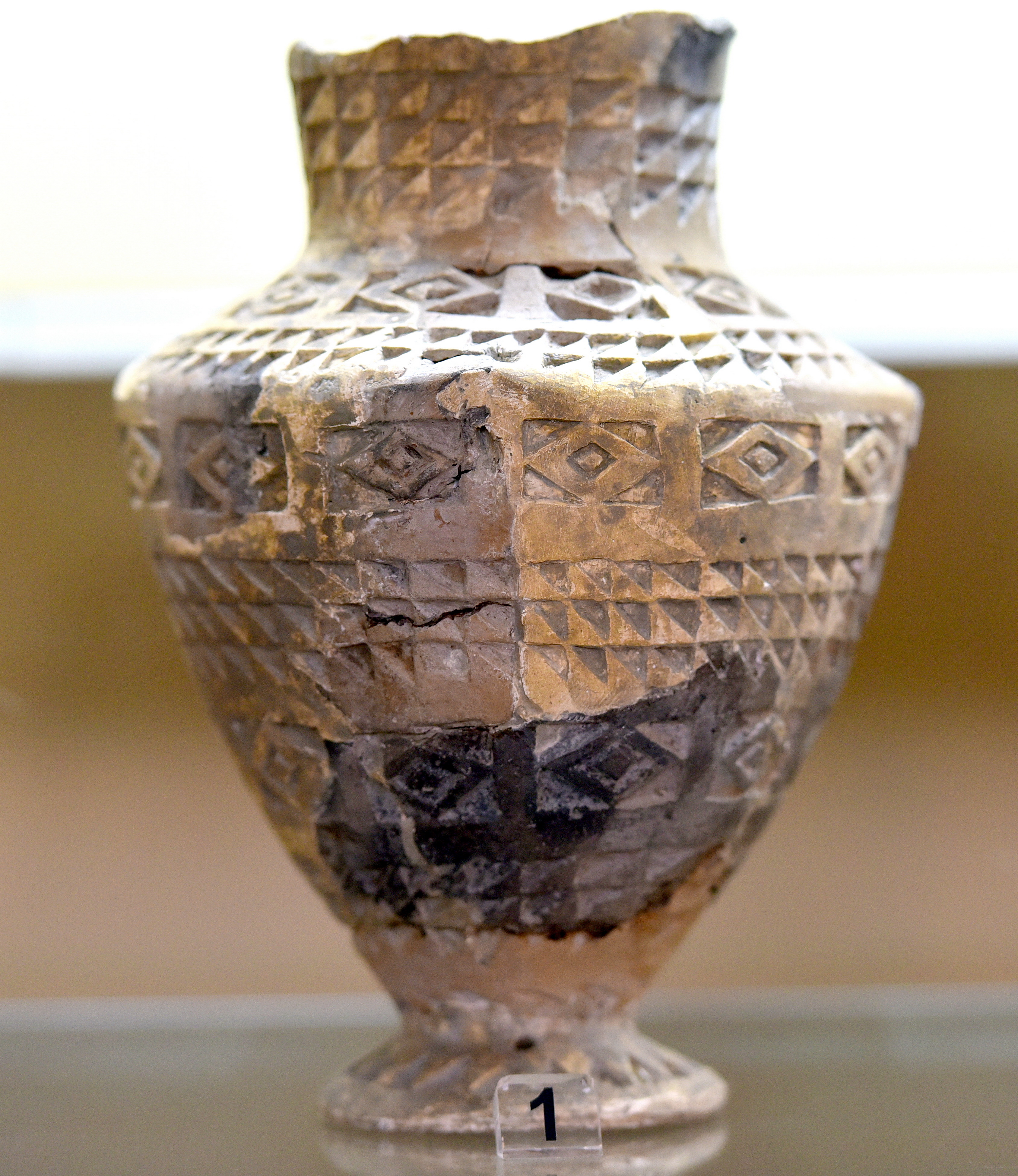 This pottery vessel was found at Nineveh, Iraq. The surface is decorated with different geometric motifs and shapes. Ninevite V period/culture of Upper Mesopotamia, c. 2900-2600 BCE. On display at the Iraq Museum in Baghdad.