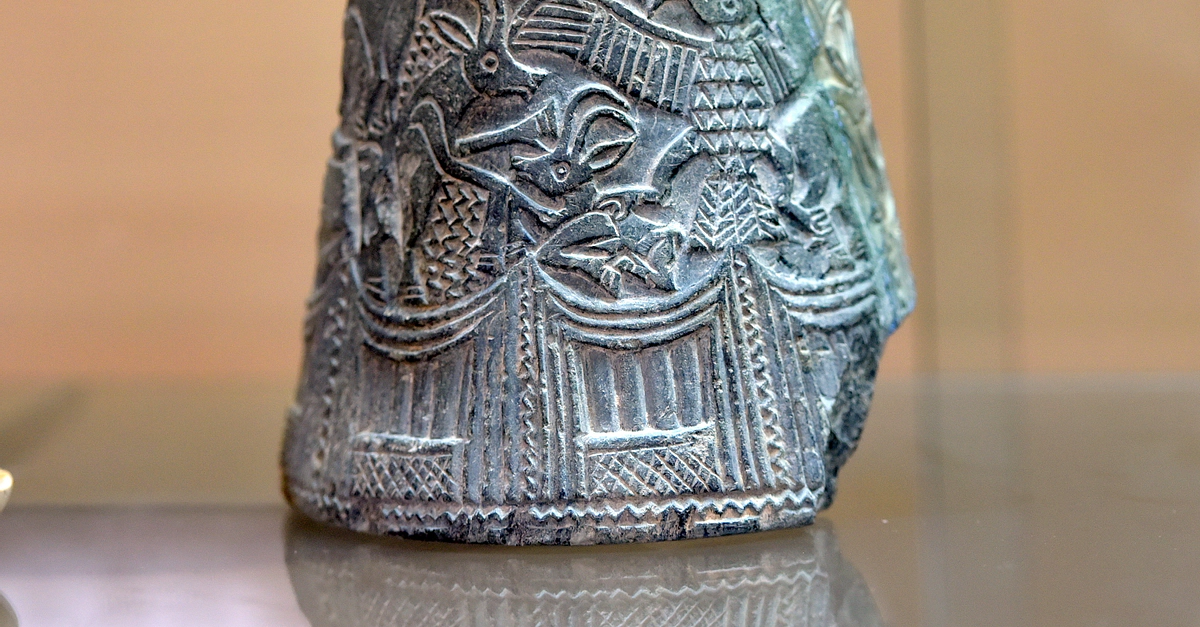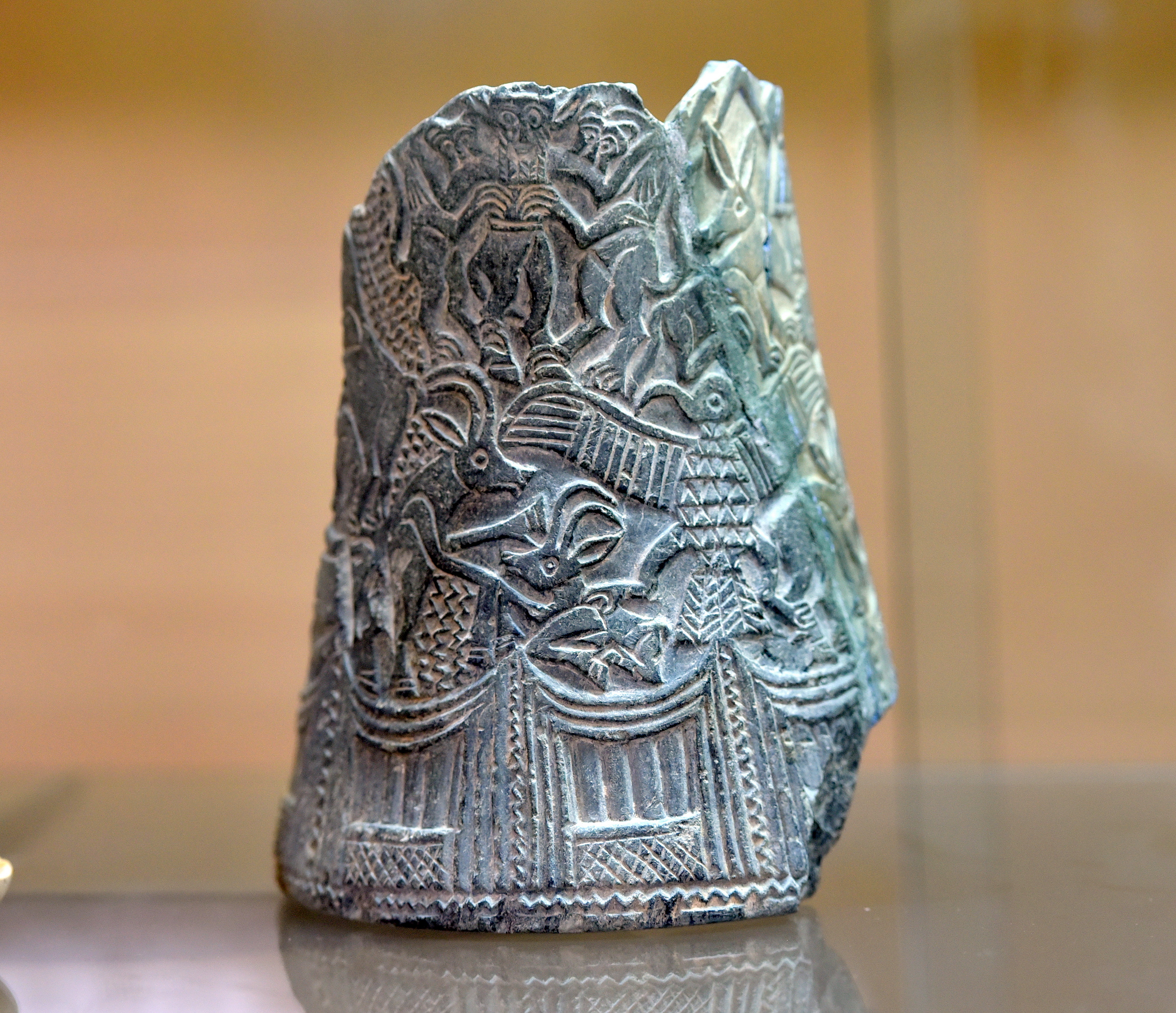 This fragment was part of a vessel made of solid greenstone. The surviving segment shows a multitude of exotic animals and birds in addition to a hero, flanked by two animals (lions?), standing before a temple facade. Probably, this scene represents a Sumerian myth. From Khafajah (ancient Tutub), Diyala, Iraq. Early Dynastic period, 2600-2400 BCE. On display at the Iraq Museum in Baghdad.