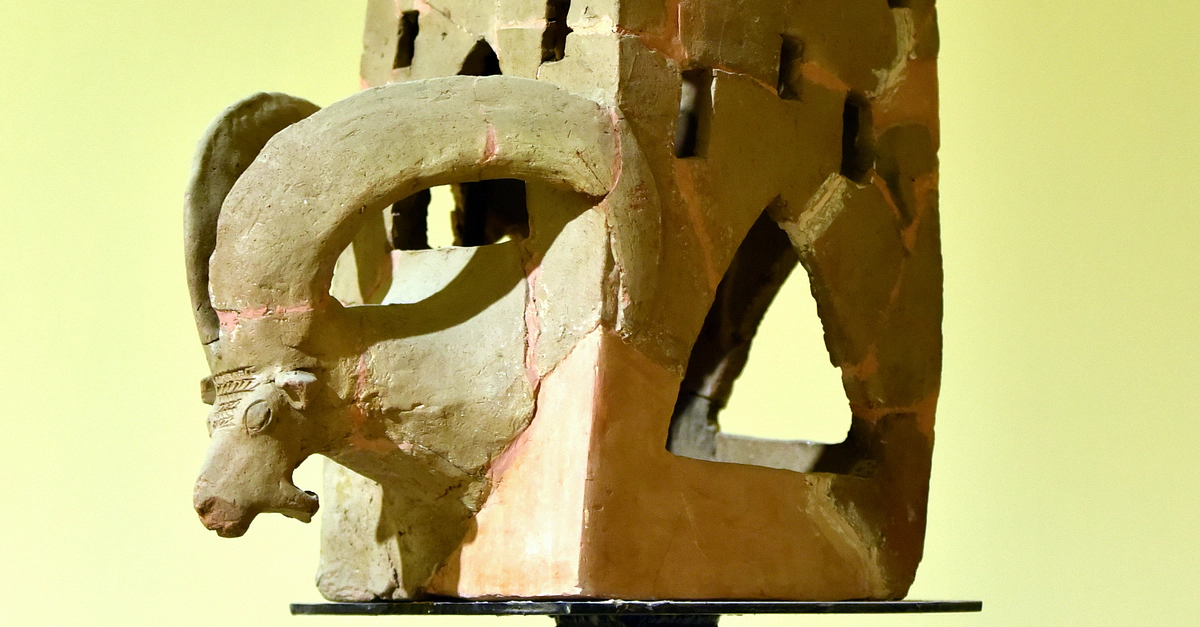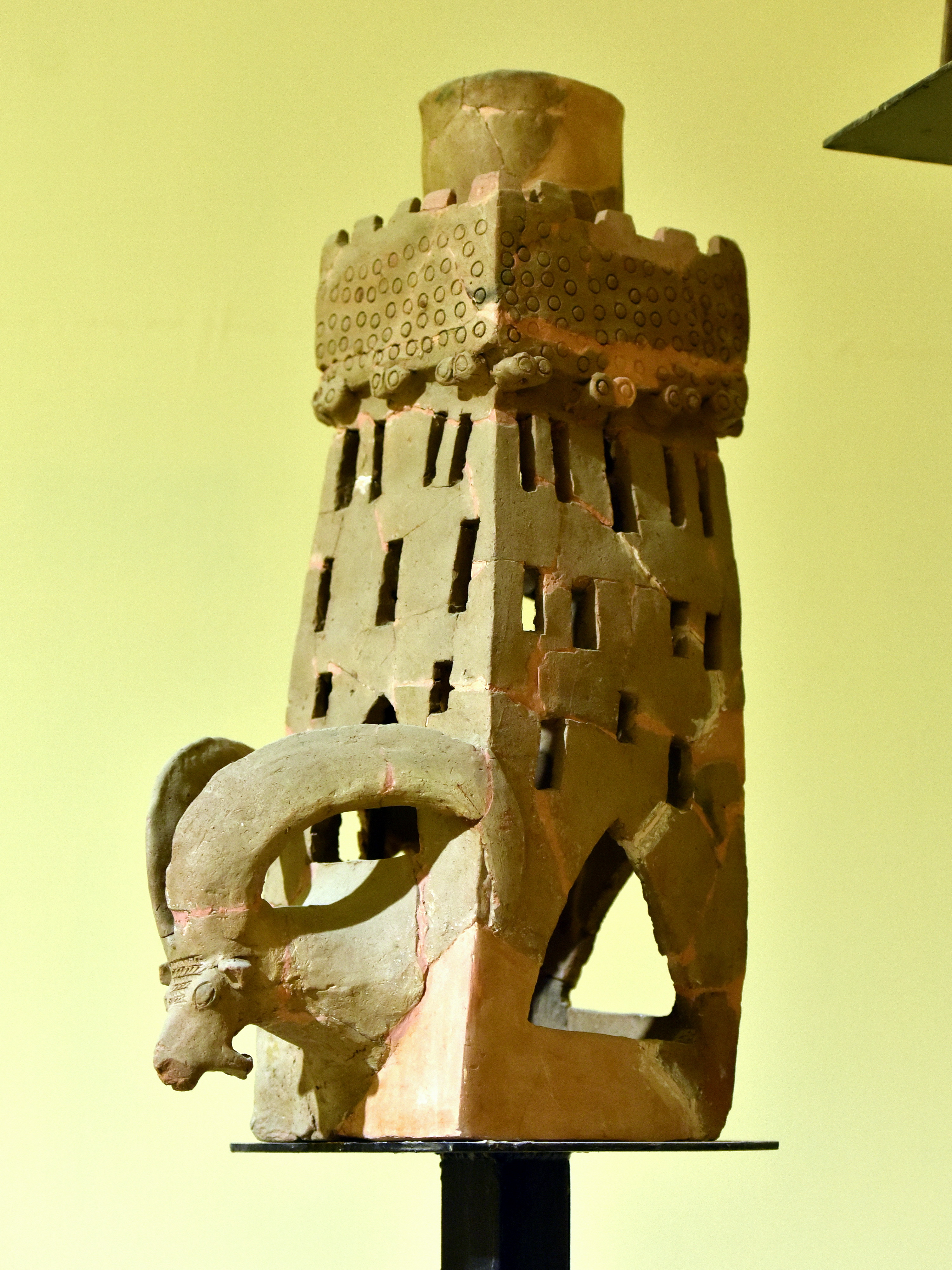 This pottery incense burner/container was found at Tell Bazmusian, Lake Dukan, Sulaymaniyah, Iraq. A wild goat is topped by a 2-story house model with a chimney. Hurrian period, mid-2nd century BCE. On display at the Iraq Museum in Baghdad. A very similar one, which was also found at Tell Bazmusian, is on display at the Sulaymaniyah Museum, Iraq.