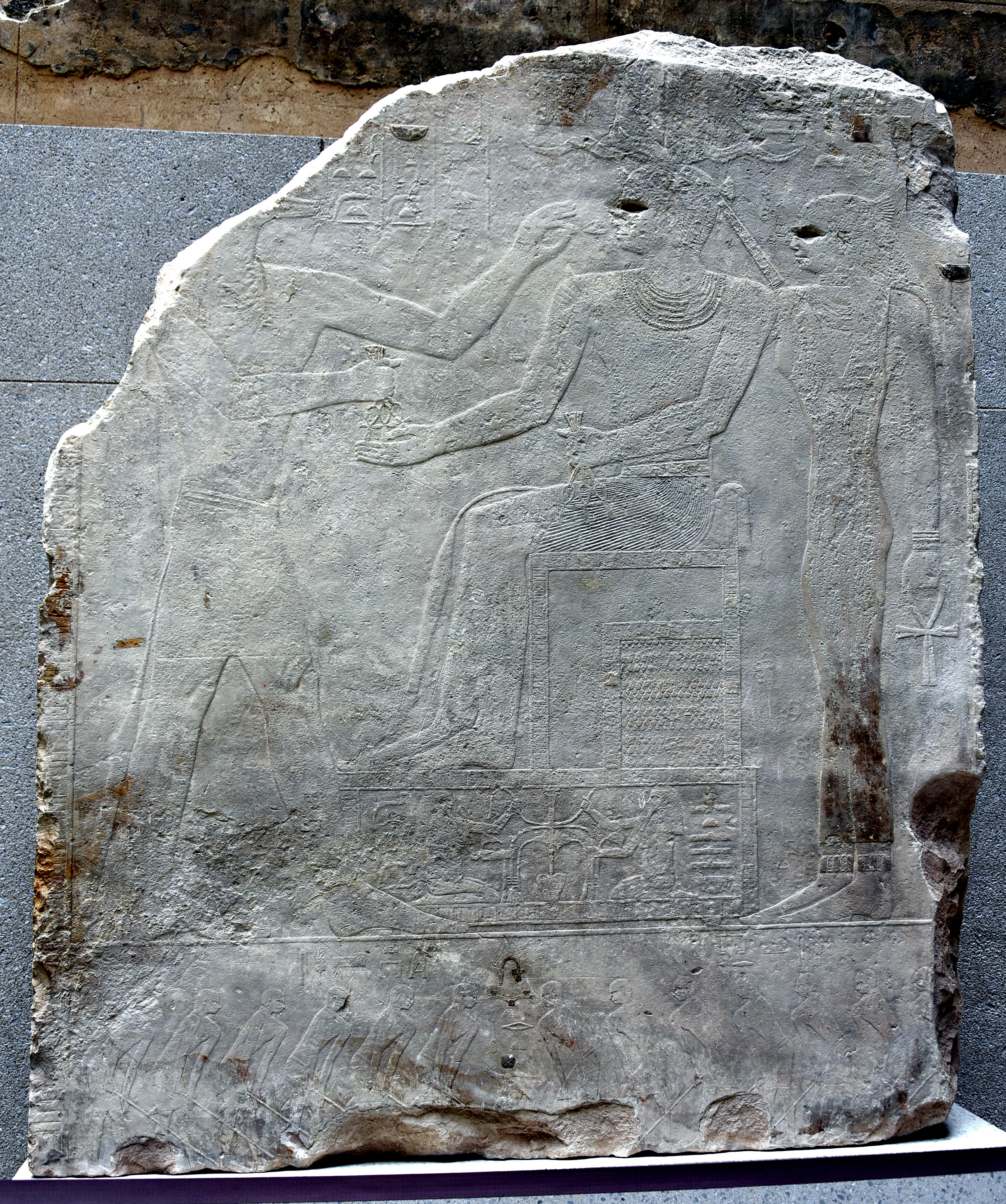The Egyptian pharaoh Niuserre Ini (Nyuserre Ini, Neuserre Ini) sits on a throne and receives life from Anubis. Old Kingdom, 5th Dynasty, second half of the 25th century BCE. From the mortuary temple of Niuserre at Abusir, Egypt. On display at the Neues Museum, Berlin, Germany.