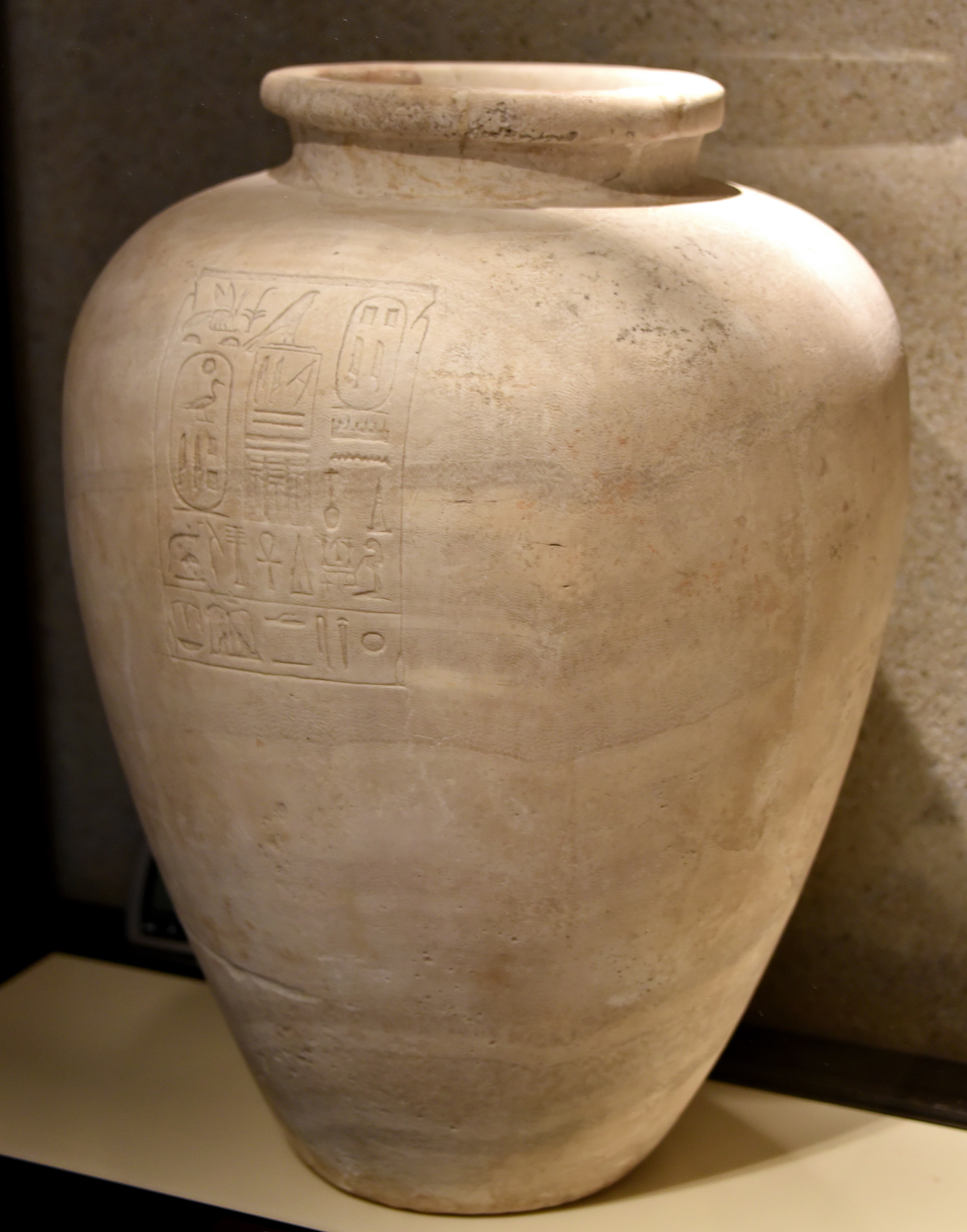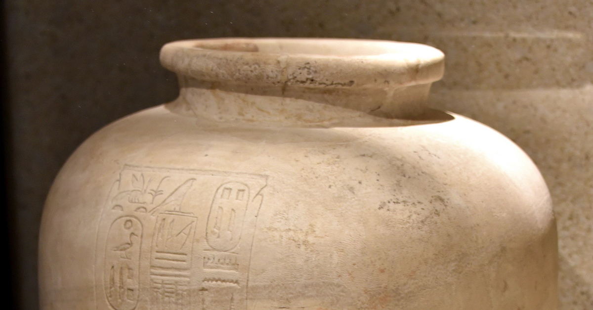 The hieroglyphic signs on this calcite-alabaster ovoid jar mention the name the Egyptian pharaoh Pepi I and his Sed festival, in addition to naming the pyramid complex of Pepi I (r. 2335-2285 BCE) at Memphis, the capital of the Old Kingdom. Old Kingdom, 6th Dynasty, 2335-2285 BCE. From Memphis, Saqqara, Egypt. On display at the Neues Museum, Berlin, Germany.