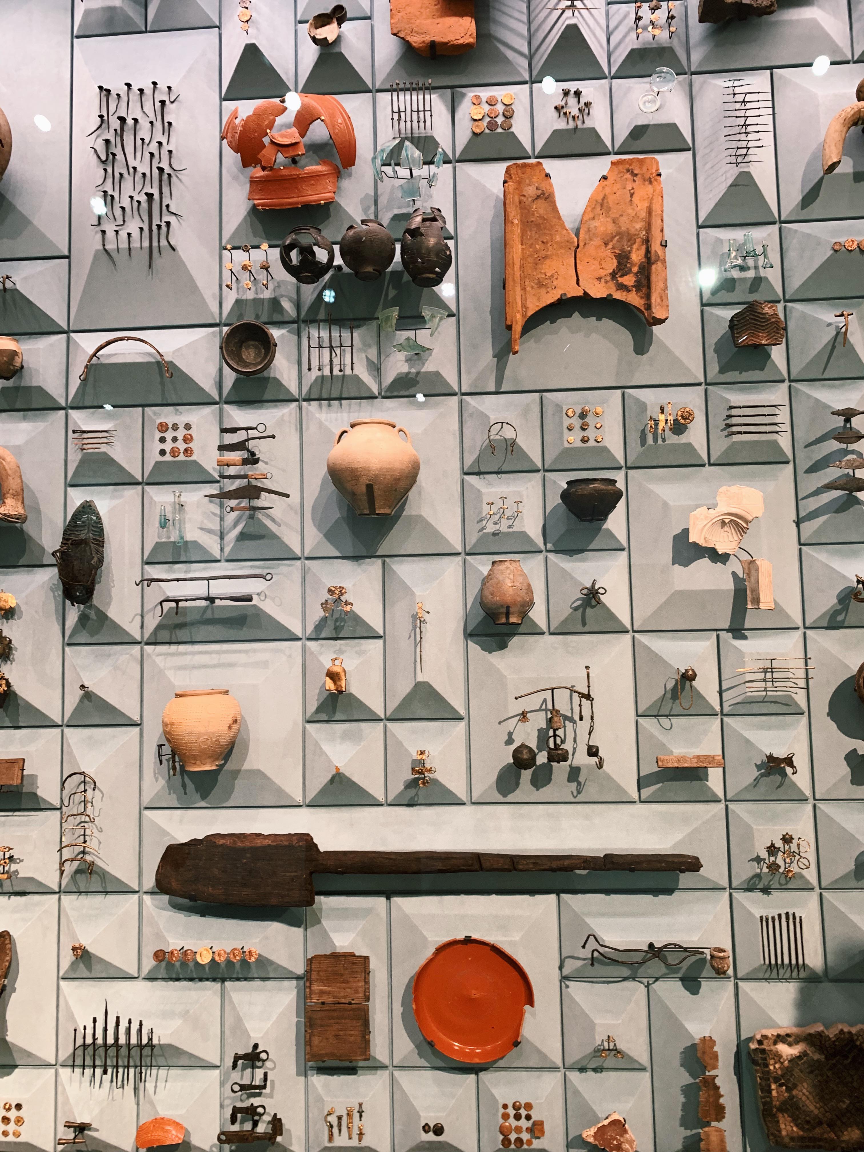 Artifacts found on the site of the London Mithraeum. The Mithraeum was built on the banks of the Walbrook river around 240 CE, and was abandoned sometime during the fall of the Roman Empire (5th century CE)