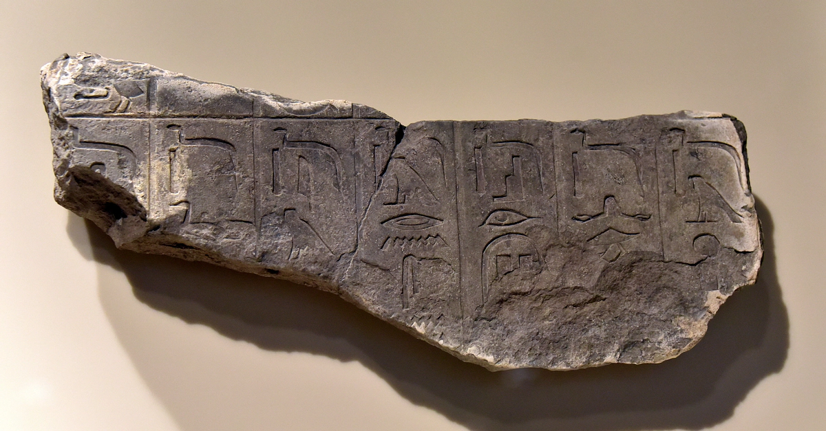 The hieroglyphic signs on this painted limestone fragment show parts of spells 354 and 225 of the pyramid texts of the Egyptian Pharaoh Pepi II (2284 - c. 2216 BCE). Old Kingdom, 6th Dynasty, 2279-2219 BCE. From Saqqara, Egypt. On display at the Neues Museum in Berlin, Germany.