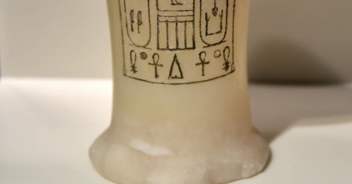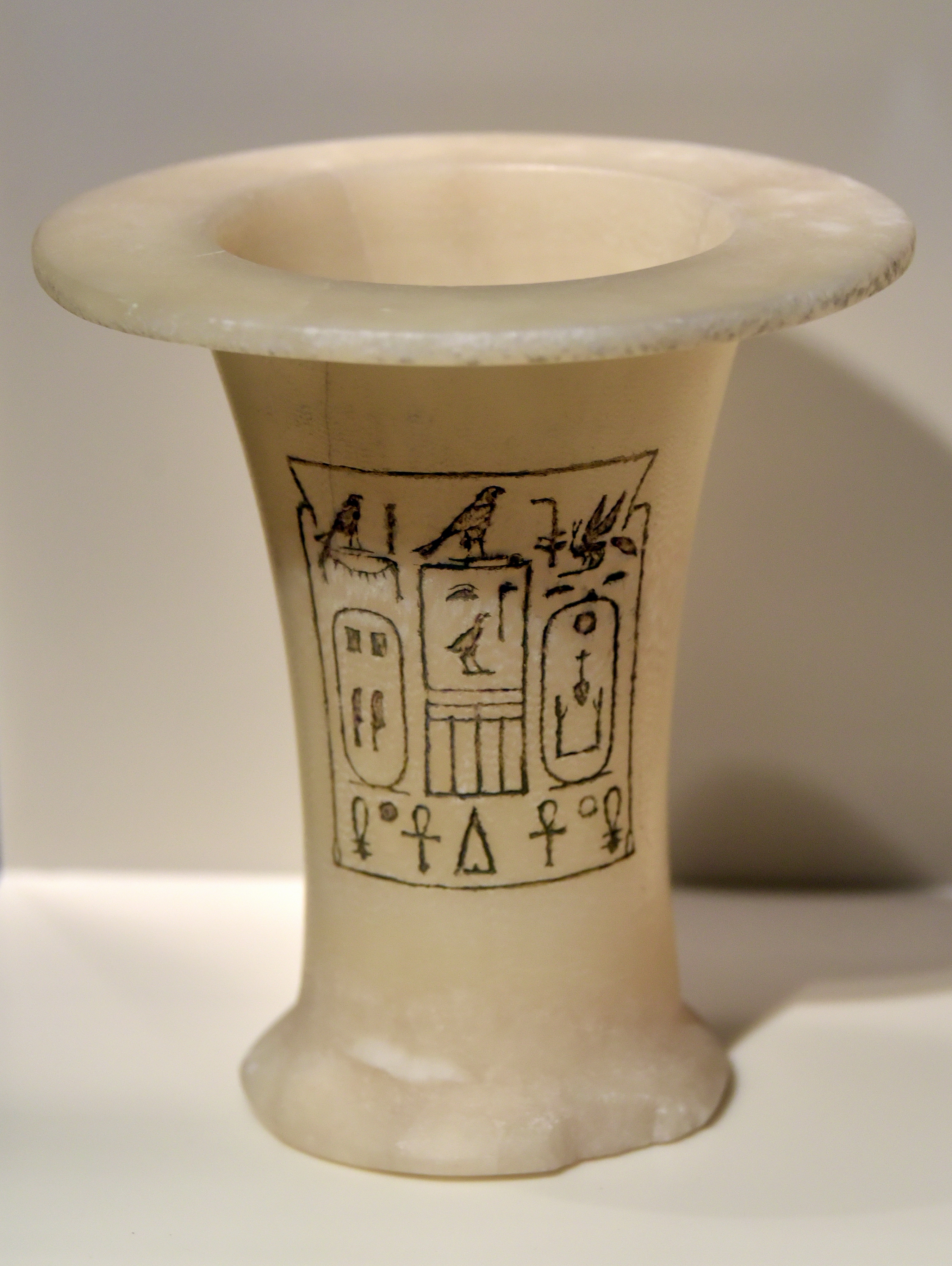 This calcite-alabaster jar (probably was a container for cosmetic oil) is inscribed with four royal titulary names of the Egyptian Pharaoh Pepi II (2284 - c. 2216 BCE). On the left is the nomen (birth name) of Pepi II. On the right is the prenomen (throne name) which reads "Nefer-ka-Re" ( Beautiful is the Ka of Re). At the middle is the Horus name (written in a serekh) while on the left upper corner lies the golden Horus name, which reads "skhm bik nbw" (the golden falcon is powerful). From Egypt, precise provenance is unknown. Old Kingdom, 6th Dynasty, 2279-2219 BCE. On display at the Neues Museum in Berlin, Germany.