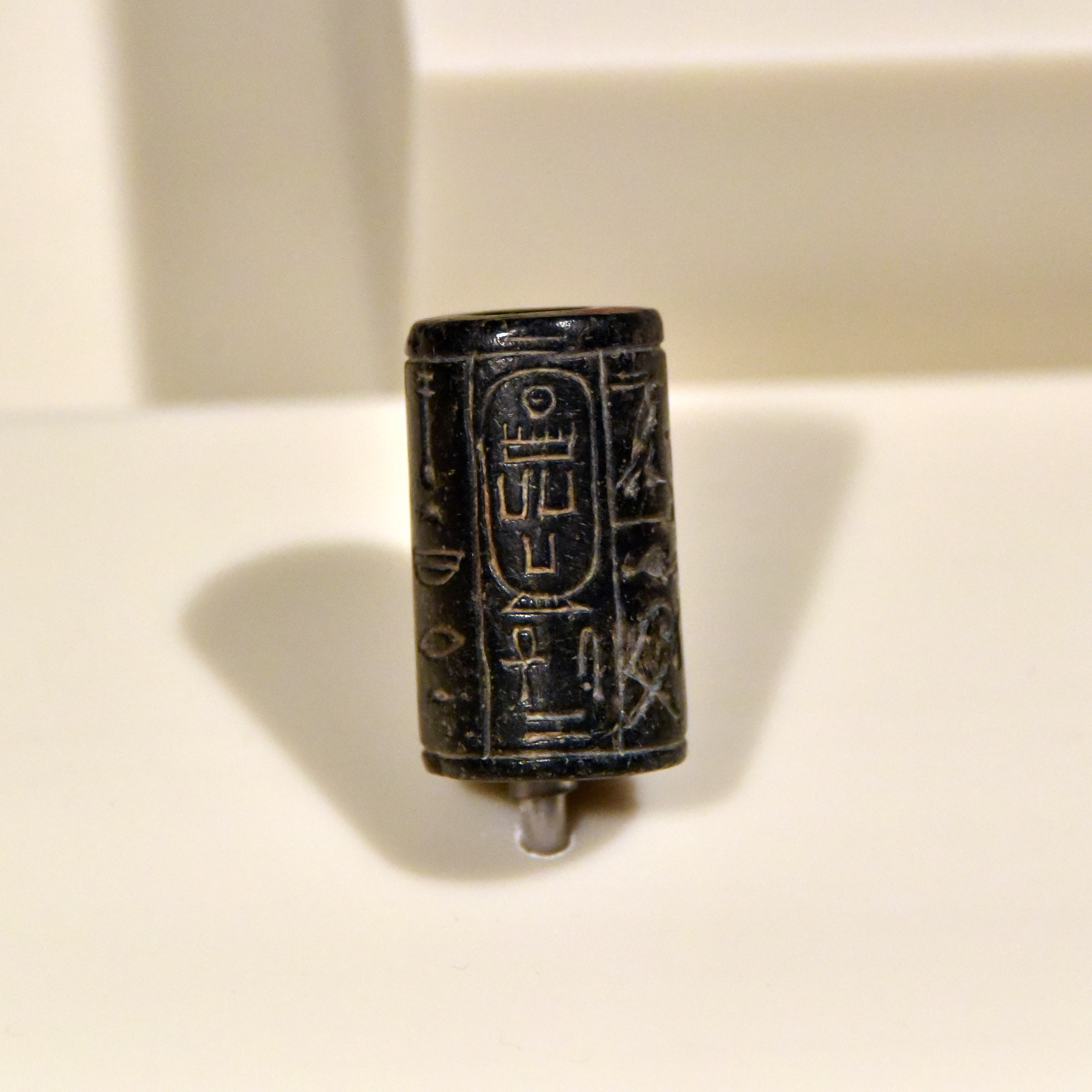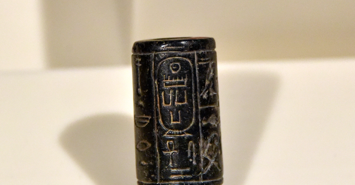 On this basalt cylinder seal, the name of the Egyptian pharaoh Menkaure (2532 - c. 2500 BCE) appears within a cartouche. From Egypt, precise provenance is unknown. Old Kingdom, 4th Dynasty, reign of Menkaure, 2539-2511 BCE. On display at the Neues Museum in Berlin, Germany.