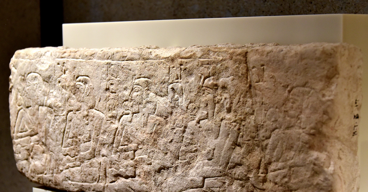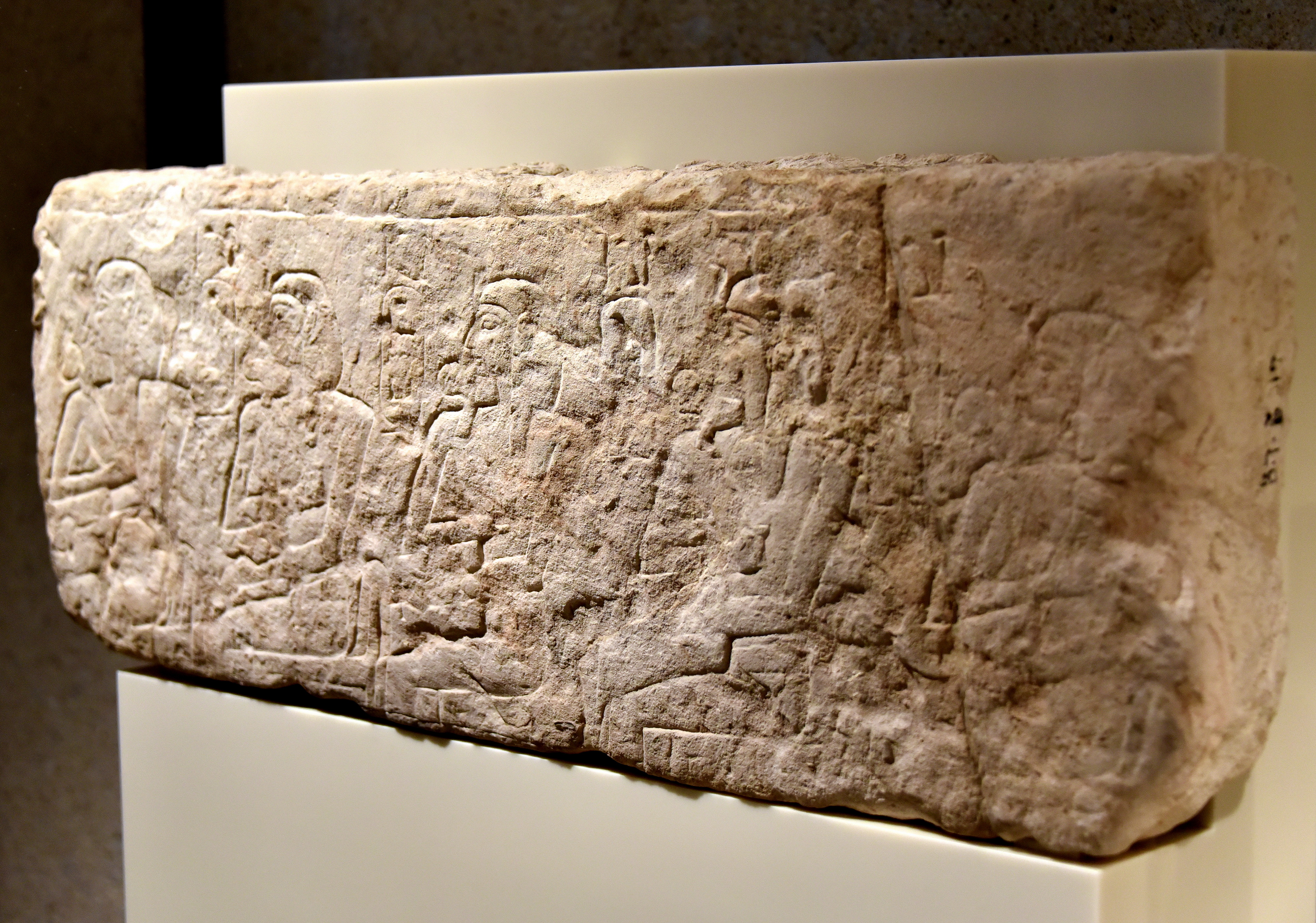 This limestone fragment came from a New Kingdom tomb at Abusir/Saqqara, Egypt. The relief depicts five enthroned pharaohs, looking to the left. In front of the face of every one of them, a cartouche is inscribed. Only the cartouche at the middle somewhat has survived and can be read as Menkaura (Menkaure). New Kingdom, 19th Dynasty, 1292-1186 BCE. On display at the Neues Museum in Berlin, Germany.