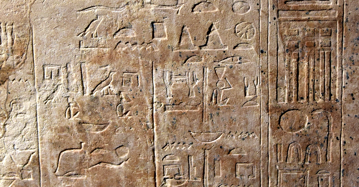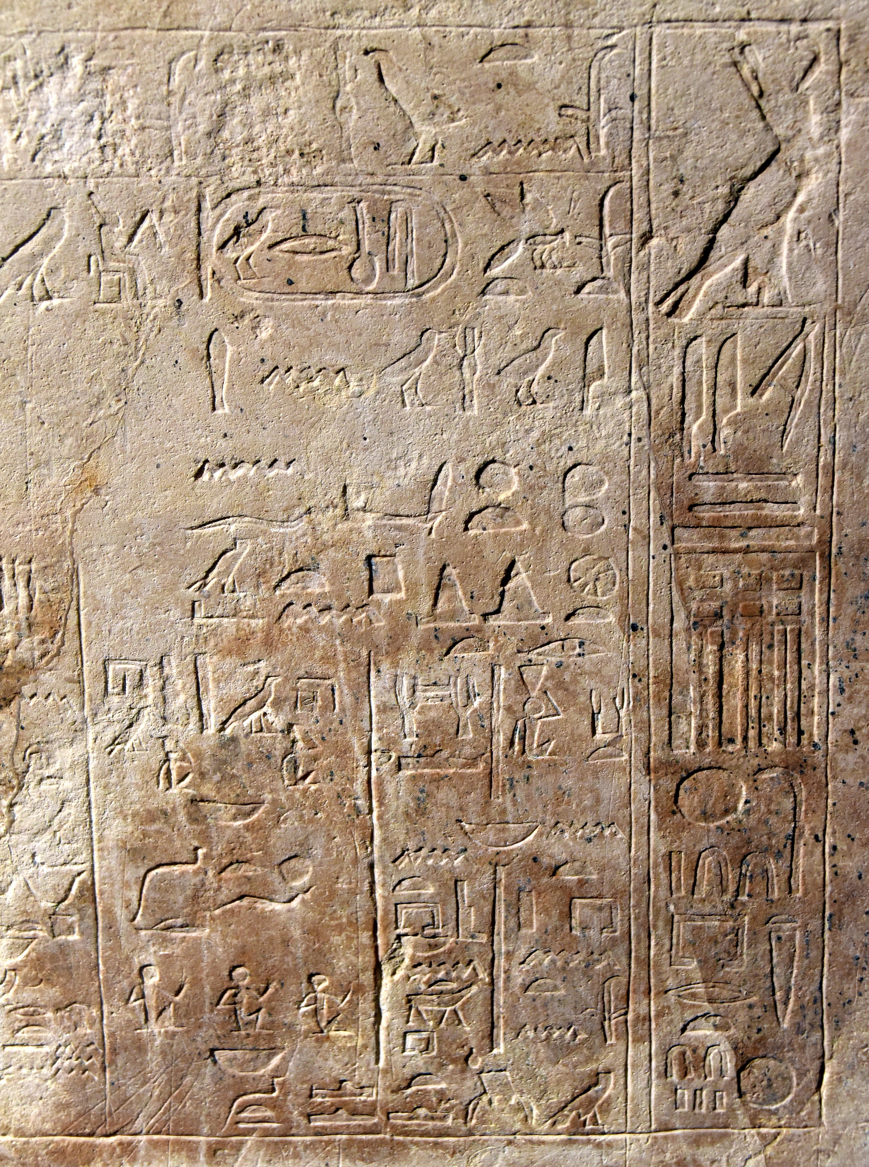 This is a detail of a large limestone fragment which came from the pyramid complex of the Egyptian pharaoh Sneferu (r. 2613 to 2589 BCE) of the 4th Dynasty of Egypt. This is one of the very few and important legal texts from the Old Kingdom. Pepi I (r. 2335-2285 BCE) of the 6th Dynasty issued a decree which states that the town and its inhabitant surrounding the pyramid complex of his predecessor Sneferu have certain privileges and protection; for example, priests conducting religious rituals for Sneferu there are exempted from corvée and taxes. The Horus name of Pepi I (mry-tꜢwi; Beloved of the Two Lands) appears on the right while the cartouche of Sneferu can be seen at the upper mid-part of this image. From the pyramid of Sneferu at Dahshur, Egypt. Old Kingdom, 6th Dynasty, reign of Pepi I, (r. 2335-2285 BCE). On display at the Neues Museum in Berlin, Germany.