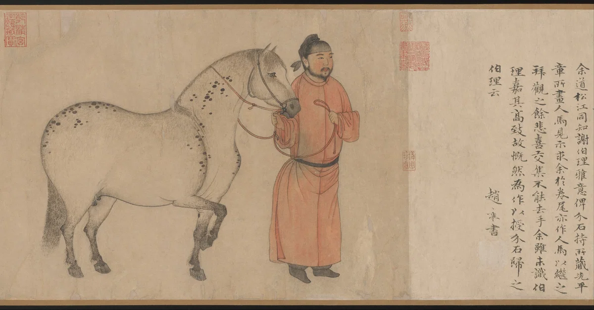 A Chinese handscroll dating from between 1296 - 1359 CE, when China was ruled by the Mongolian Yuan Dynasty. The handscroll depicts grooms with their horses, a theme which became increasingly popular during this period due to the high value placed on horsemanship in Mongolian culture. Ink and color on silk. 30.2 x 178.1 cm (12 x 70 in.) From China, now in the collection of the Metropolitan Museum of Art, NY.