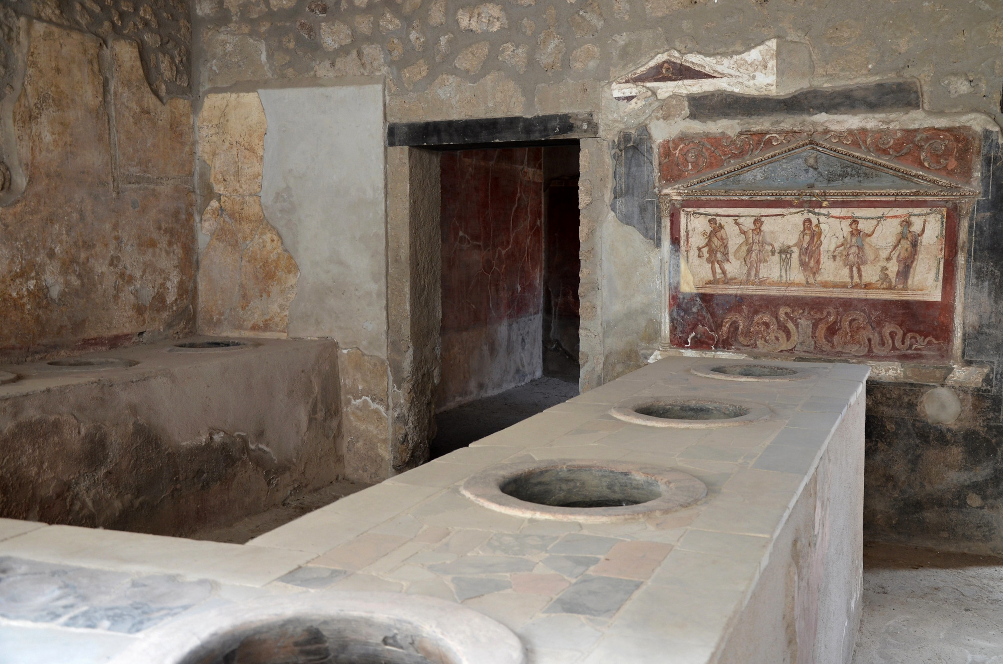 The thermopolium (cook-shop) of Vetutius Placidus in Pompeii. Thermapolia were bars which served hot food and drinks. The 'L' shaped masonry counter has large storage jars which were used to hold food. On the rear wall of the bar is a painted lararium with a scene depicting the Genius of the household (lares) performing a sacrifice over a small altar with Mercury (left) and Bacchus (right).
