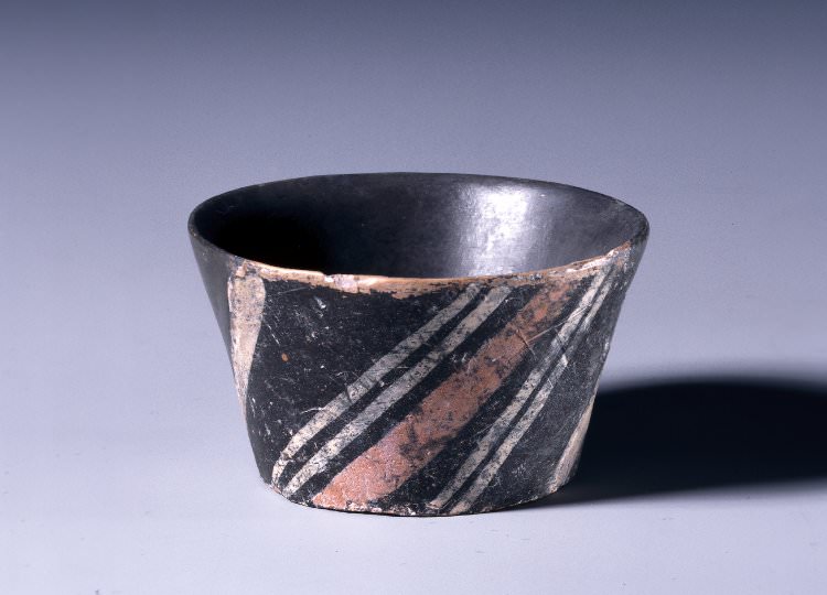 A Minoan cup in the Kamares style, a polychrome decoration of bold lines in red/orange and white on a black background, prevalent from 2000 to 1700 BCE. (British Museum, London).