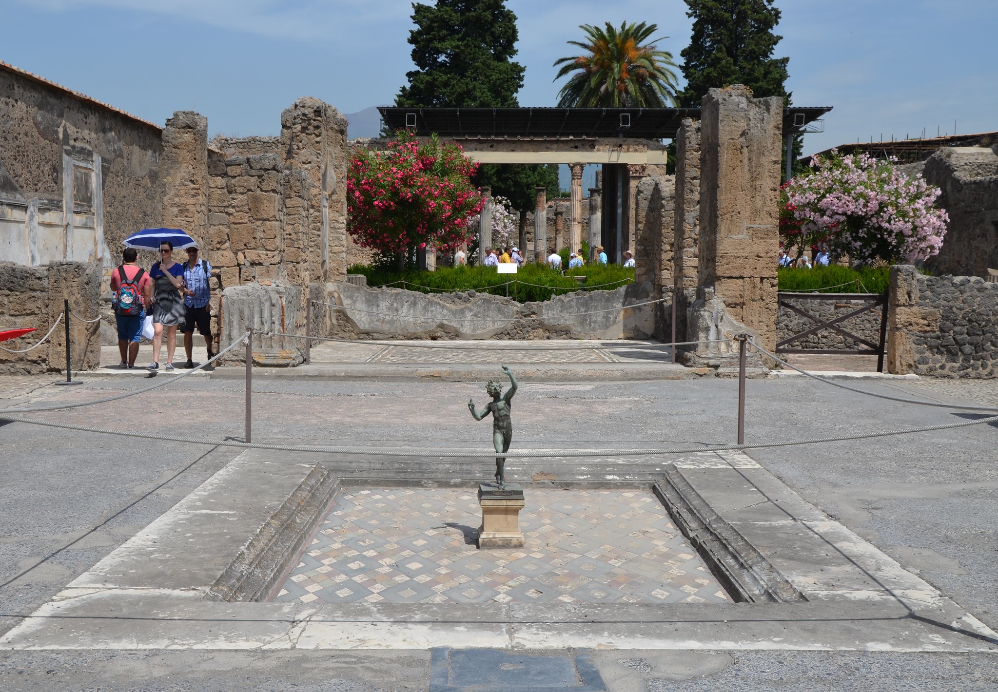 View of the large atrium of the House of the Faun in Pompeii with a central impluvium (rainwater basin) and the bronze statue of the Dancing Faun. On either side of the atrium are cubicula (bedrooms) while at the rear is the tablinum (study room) with the famous Alexander Mosaic. The House of the Faun is one of the most famous and visited houses in Pompeii.