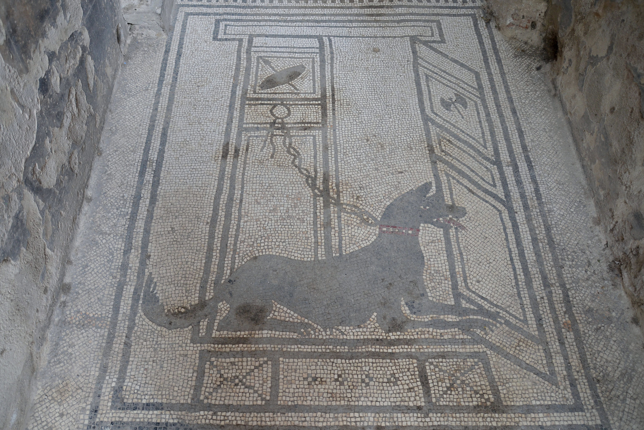 The vestibule floor of the House of Paquius Proculus in Pompeii is paved with a fine mosaic depicting a guard dog chained to a door. The House of Paquius Proculus lies on the south side of the Via dell'Abbondanza. 1st century CE.