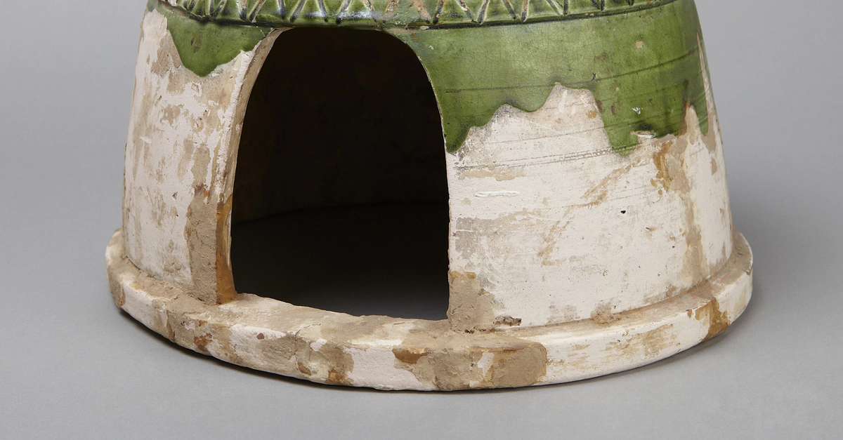 A clay model of a yurt or Mongolian tent with a green leaf glaze. Made in China during the Yuan Dynasty (1260 – 1368 CE). Fine, cream-colored clay with leaf green glaze. h. 21.0 cm., diam. 27.0 cm. (8 1/4 x 10 5/8 in.) From the Princeton University Art Museum in New Jersey, USA. Gift of J. Lionberger Davis, Class of 1900.