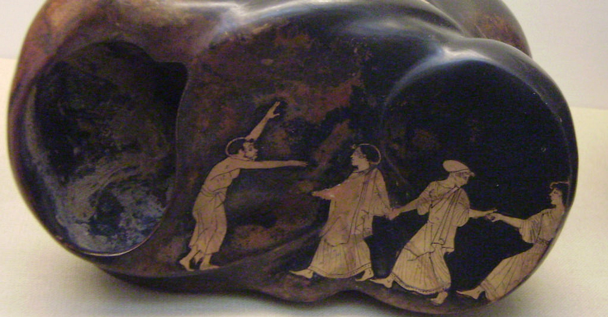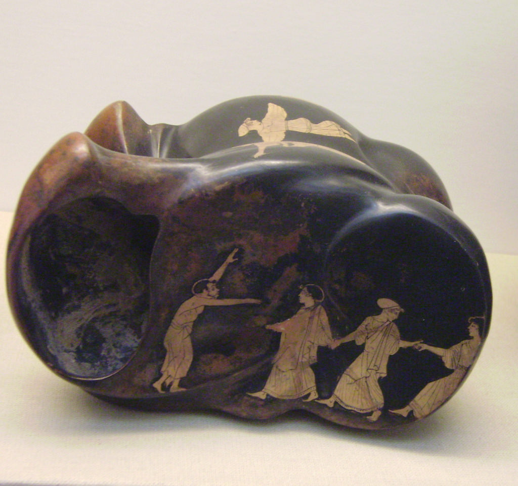 An Attic astragalos clay vessel depicting possibly Aelous directing the dance of the clouds, 470-450 BCE. These vessels took the form of a knucklebone (hence their name) and were possibly used to also store sheep knucklebones which were used as gaming pieces and dice. (The British Museum, London).