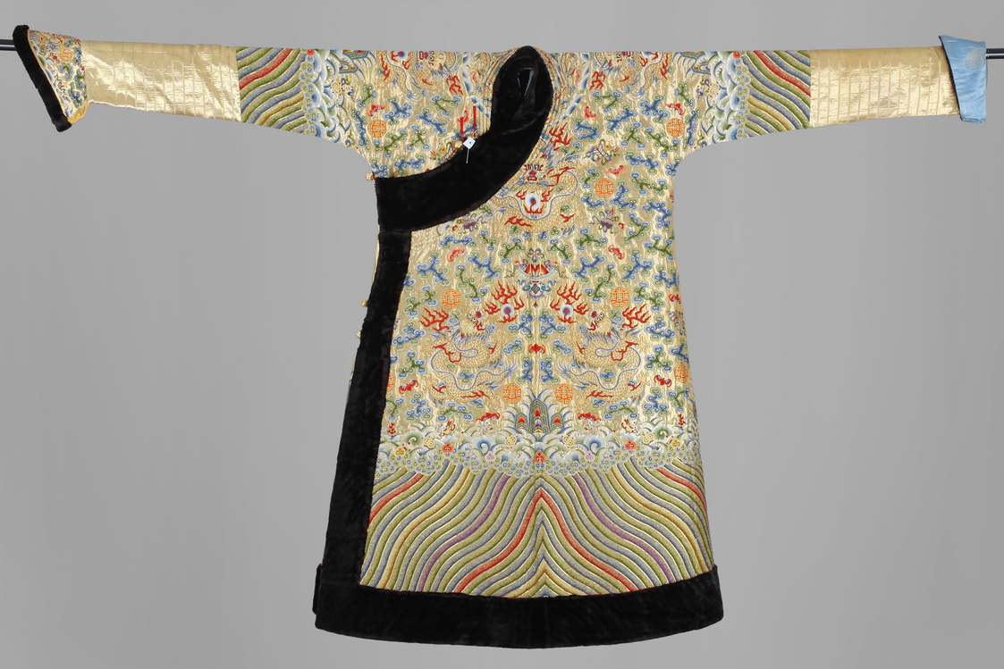 A traditional Mongolian deel robe. The embroidery and fur trim of this example indicate it was likely worn at the imperial court.