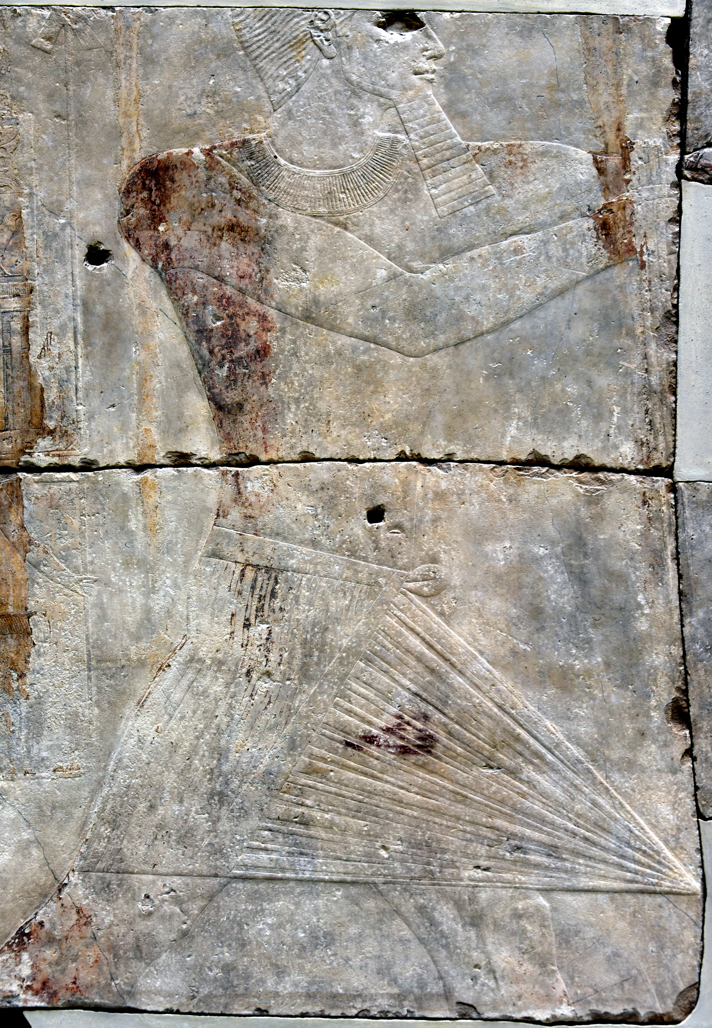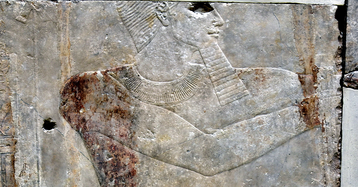 This is a detail of a large limestone relief (showing the great royal hunting scene of the Egyptian pharaoh Sahure). Here, Sahure wears a knee-length kilt. From the Valley-Temple, Pyramid Complex of Sahure at Abusir, Egypt. Old Kingdom, 5th Dynasty, 2496-2483 BCE. It is on display at the Neues Museum, Berlin, Germany.