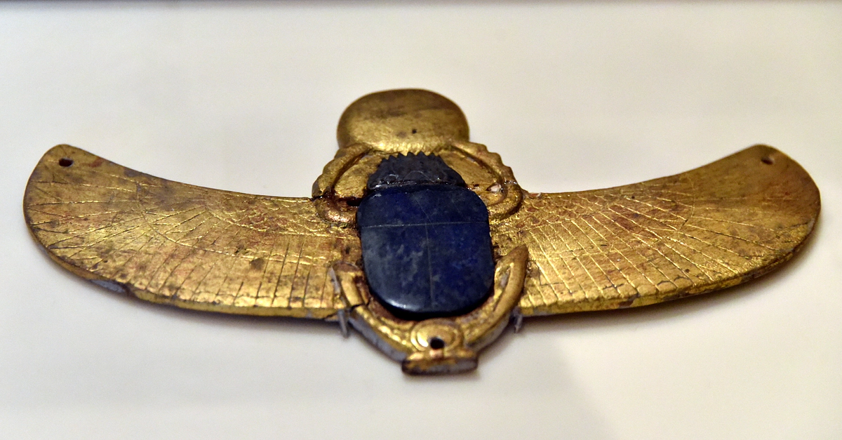 This winged scarab was put on a mummy cover. Gold and faience. From Thebes, Egypt. Late Period, 746-332 BCE. It is on display at the Neues Museum, Berlin, Germany.