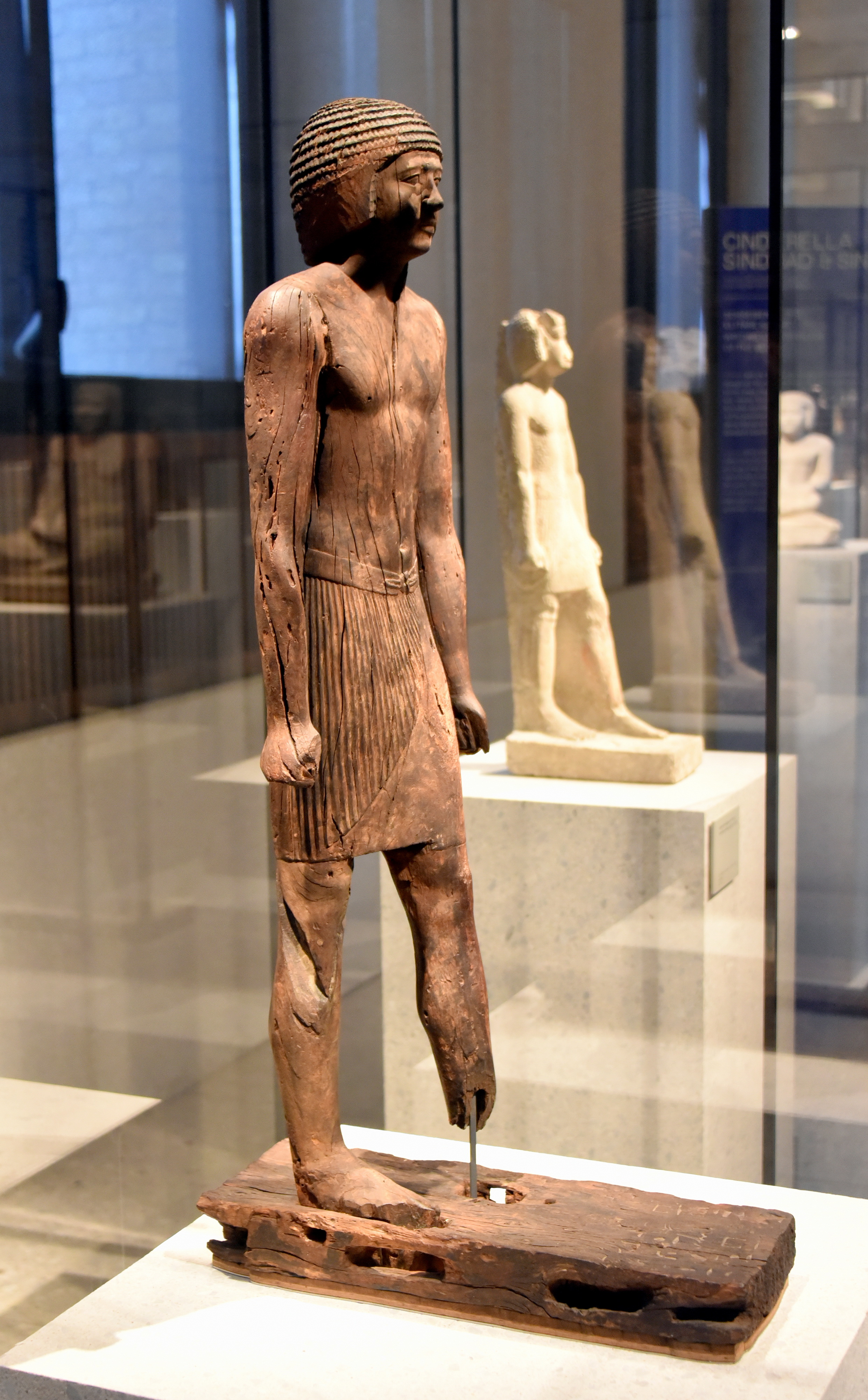 Standing-striding statue of Per-her-nefret, foremost of the lands of the king. Wood. Old Kingdom, 5th Dynasty, 3350-3300 BCE. From Fayum, Kafr Ammar (Tarkhan), Egypt. It is on display at the Neues Museum, Berlin, Germany.