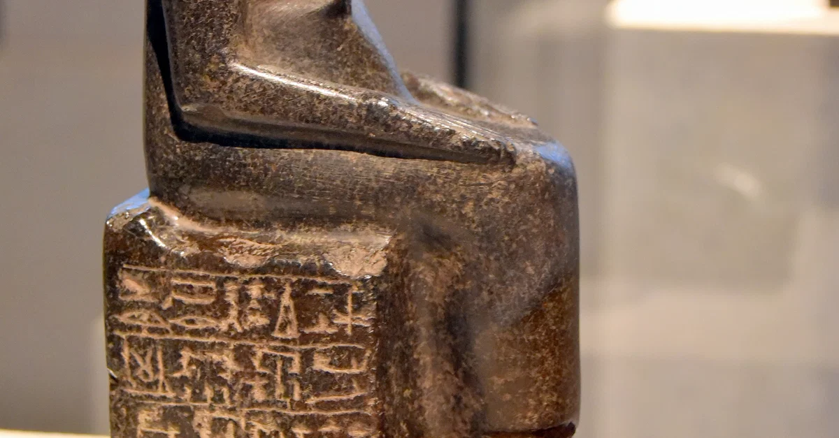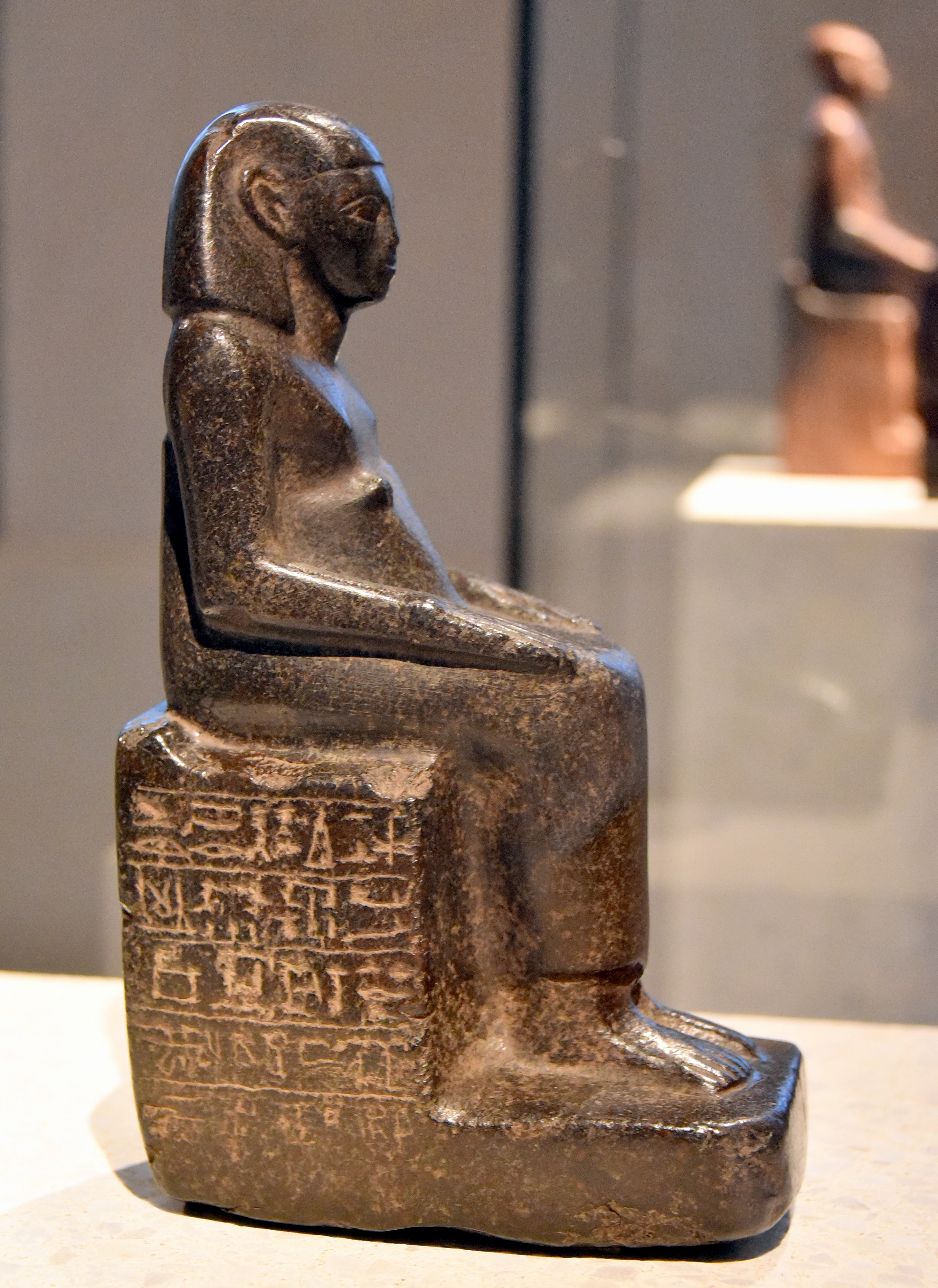 Seated figure of the Egyptian governor Hori with an inscription of a prayer to the god Ptah-Soker-Osiris. Basalt. Middle Kingdom, 13th Dynasty, 1750-1700 BCE. From Egypt, precise provenance unknown. It is on display at the Neues Museum, Berlin, Germany.
