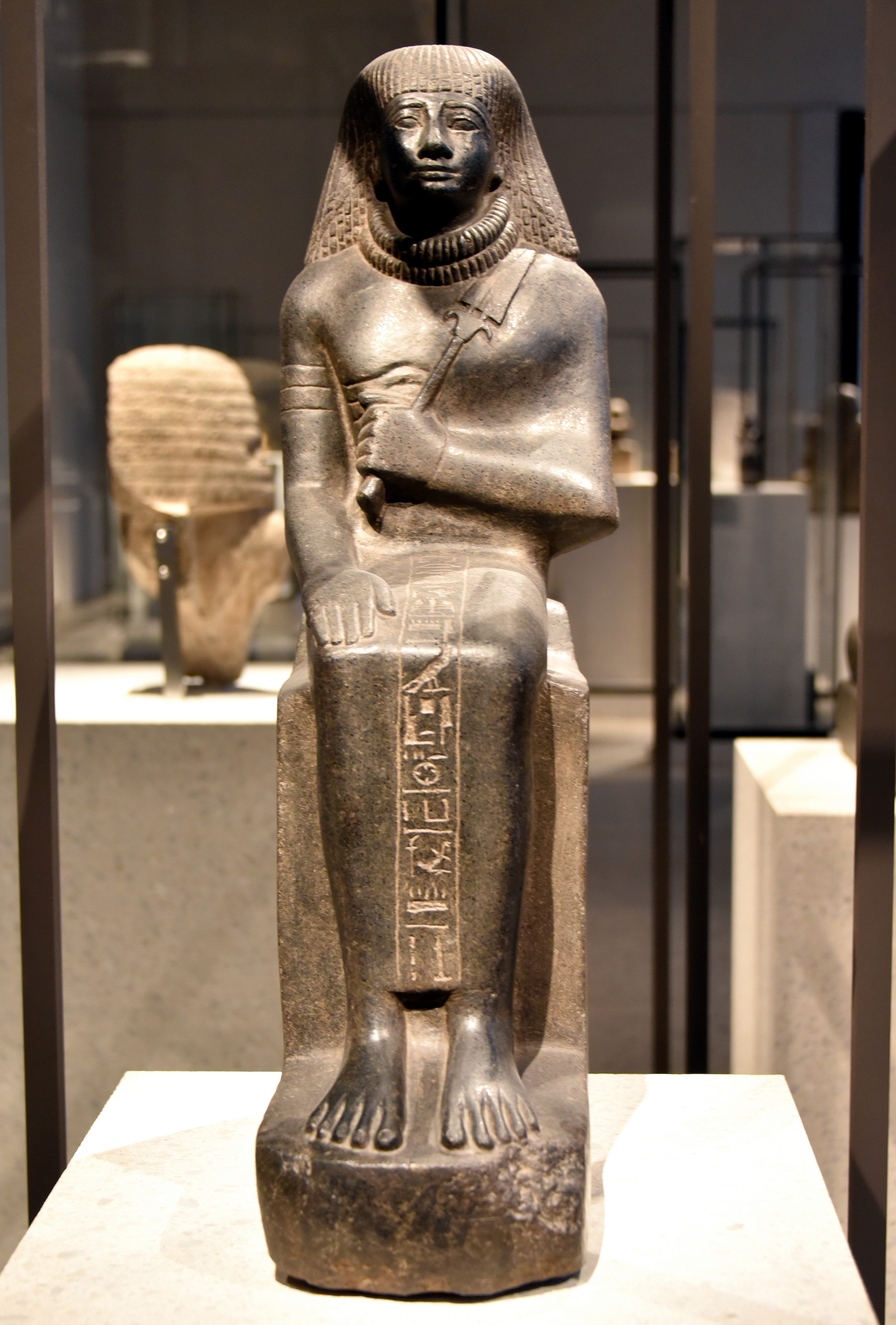 Seated figure of Men-techenu, the fanbearer of the pharaoh. Grano-diorite. From Thebes, Karnak, Egypt. New Kingdom, 18th Dynasty, reign of Thutmose III/Amenhotep II, 1479-1397 BCE. It is on display at the Neues Museum, Berlin, Germany.
