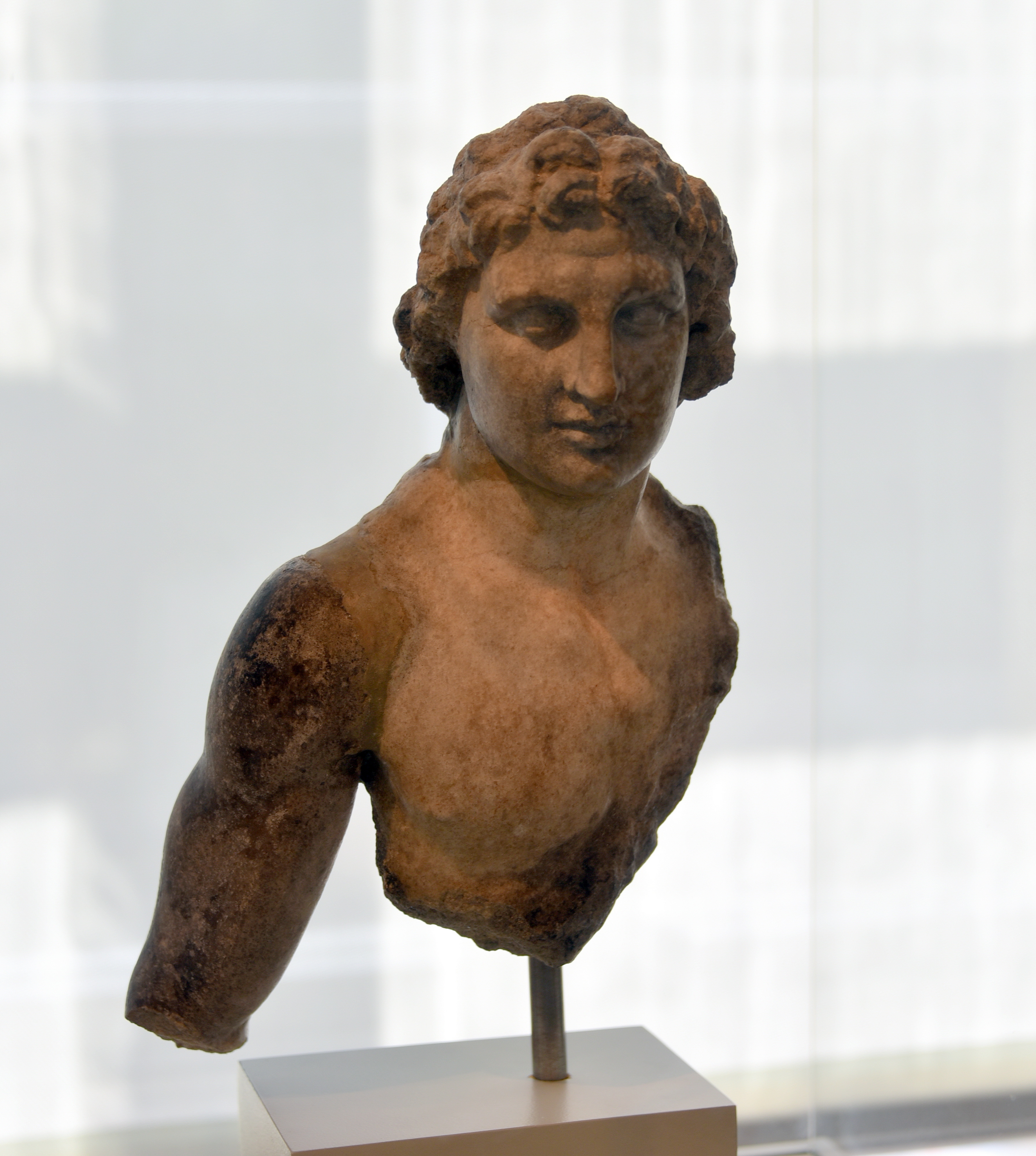 This statuette once stood as a votive in the ritual chamber of the "Holy House" in Priene (Ionia Region, Turkey). The features of the statuette, as well as attributes like the flowing hair and emotional gaze, are strongly reminiscent of Alexander the Great (r. 356 - 323 BCE). The damaged figure has to be restored with a cloak and a scabbard, which are not consistent with known portraits of Alexander the Great. The figure could instead portray one of the heroes associated with Alexander. Marble. C. 160 BCE. It is on display at the Altes Museum in Berlin, Germany.