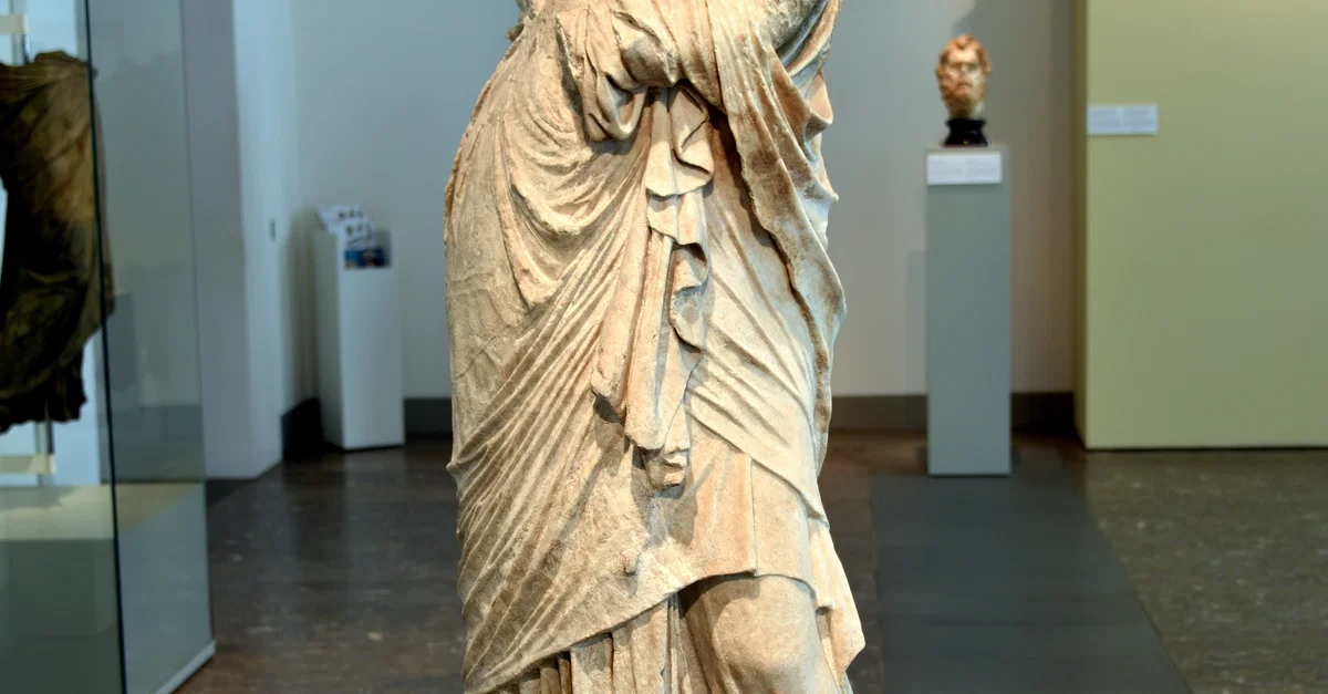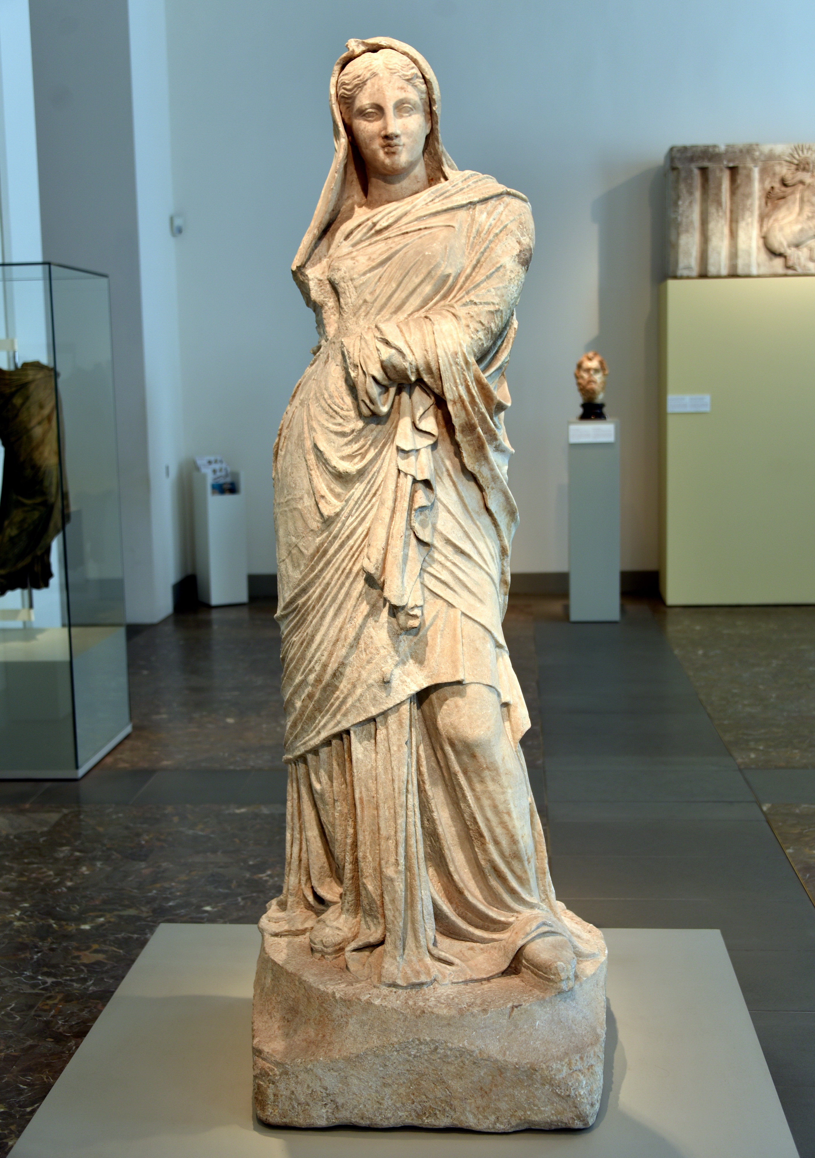 This is an idealized image of a female citizen from Magnesia. This honorific statue for a benefactress of the city stood in the town hall of Magnesia on the Maeandar (in modern-day Turkey). The missing inscription on the base of the statue gave information on her identity and the reason for the honor. Marble. C. 120-100 BCE. It is on display at the Altes Museum in Berlin, Germany.