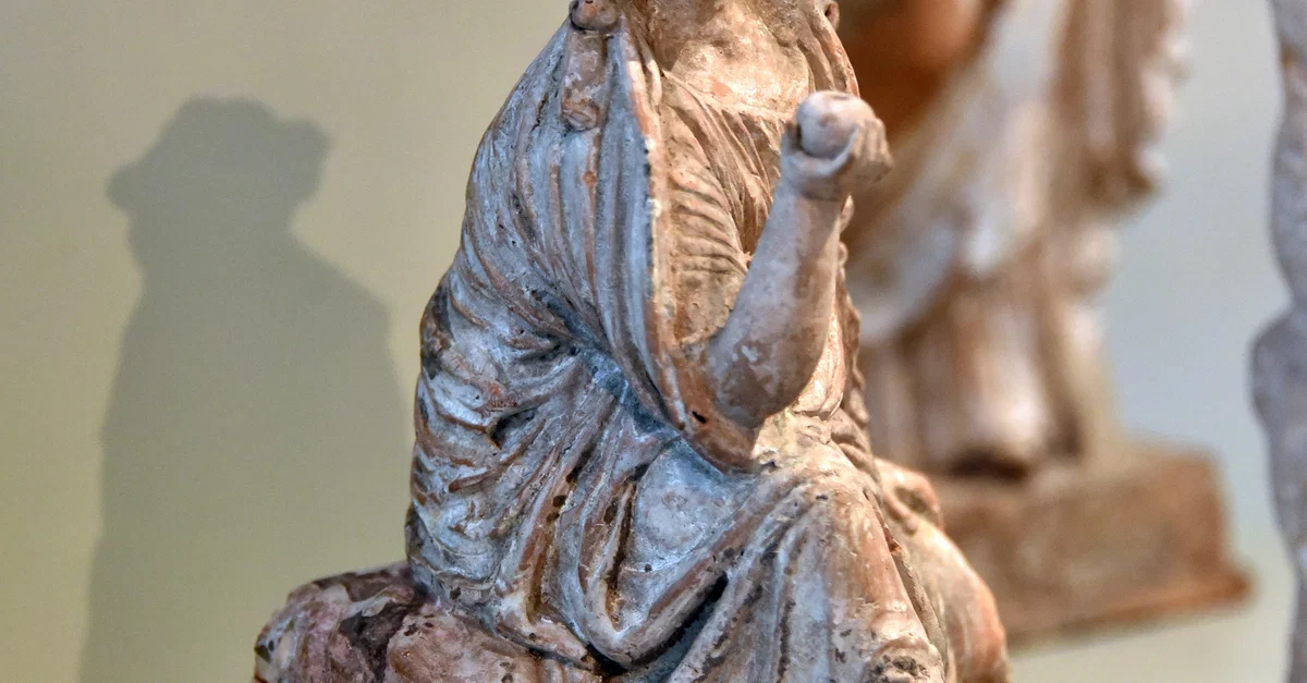 This small terracotta figurine is part of the so-called "Tanagra Figurines", which represent wealthy middle-class women. These statuettes served as votive and funerary objects, carrying a symbolic meaning connected with the status and role of "middle-class women". In the modern period, these statuettes were misconstrued as simple genre and decorative trinkets and were often forged. Hellenistic statuettes of girls and women in rich robes are often called "Tanagras" after the most important site where they were found, the country town of Tanagra in Boeotia (in modern-day Greece). Tanagras were, however, just one of many production sites of such figurines; others were located in Athens (in Greece), Tarentum (in Southern Italy), Myrina (in Turkey), and Alexandria (in Egypt). The figures are remarkable for their wide sun hats, jewelry, fans, and lively colors. 325-150 BCE. It is on display at the Altes Museum in Berlin, Germany.