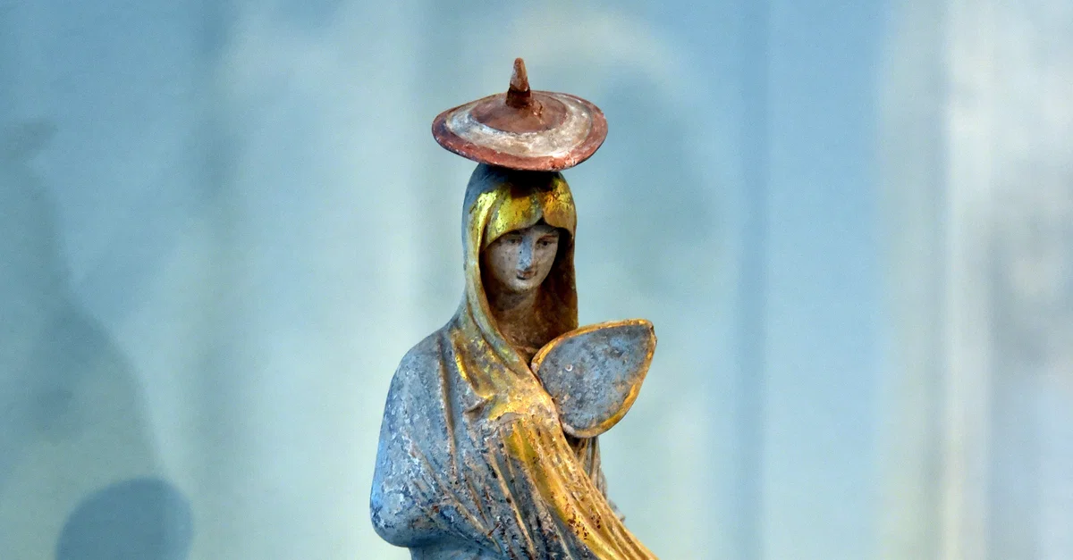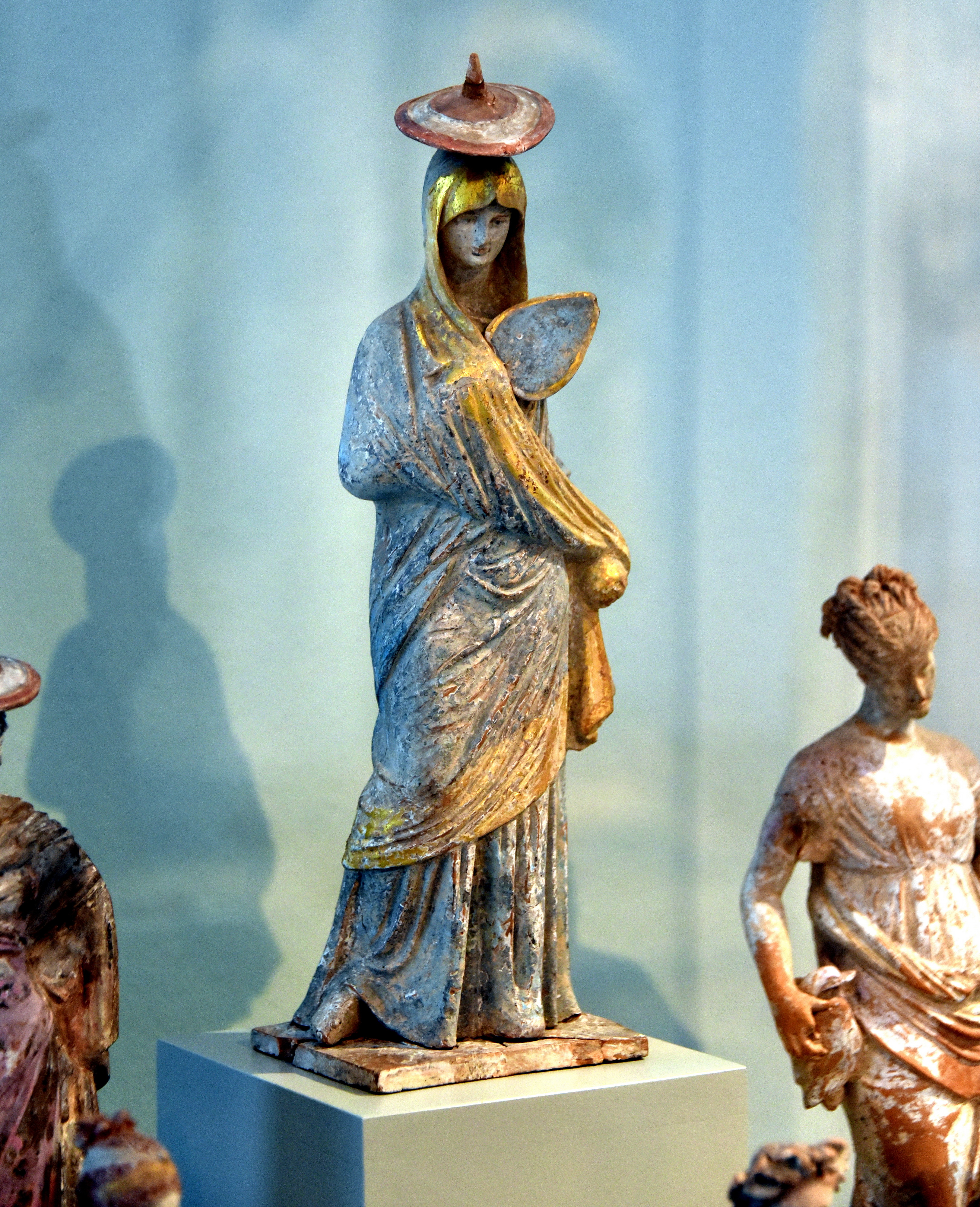 This small terracotta figurine is part of the so-called "Tanagra Figurines", which represent wealthy middle-class women. These statuettes served as votive and funerary objects, carrying a symbolic meaning connected with the status and role of "middle-class women". In the modern period, these statuettes were misconstrued as simple genre and decorative trinkets and were often forged. Hellenistic statuettes of girls and women in rich robes are often called "Tanagras" after the most important site where they were found, the country town of Tanagra in Boeotia (in modern-day Greece). Tanagra was, however, just one of many production sites of such figurines; others were located in Athens (in Greece), Tarentum (in Southern Italy), Myrina (in Turkey), and Alexandria (in Egypt). The figures are remarkable for their wide sun hats, jewelry, fans, and lively colors. 325-150 BCE. It is on display at the Altes Museum in Berlin, Germany.
