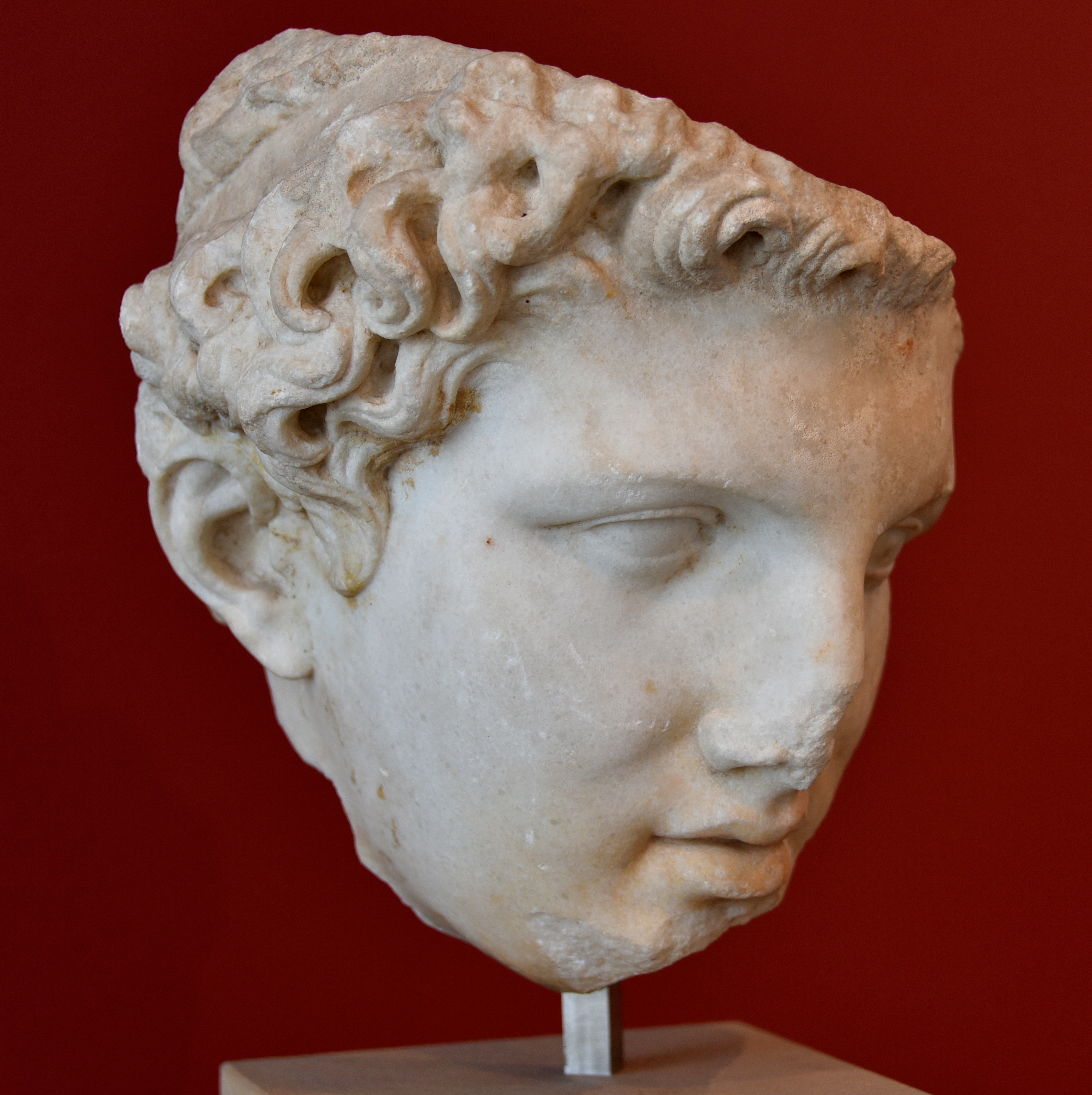 This partly preserved head of a young man with idealized facial features is understood to represent a Hellenistic ruler, due to the band in his curly hair. Certain classification is however not possible. Historically plausible suggestions are of an Attalid or Seleucid king. Marble. Found near the market gate at Miletus, Turkey in 1903 CE. Circa 150 BCE. It is on display at the Altes Museum in Berlin, Germany.