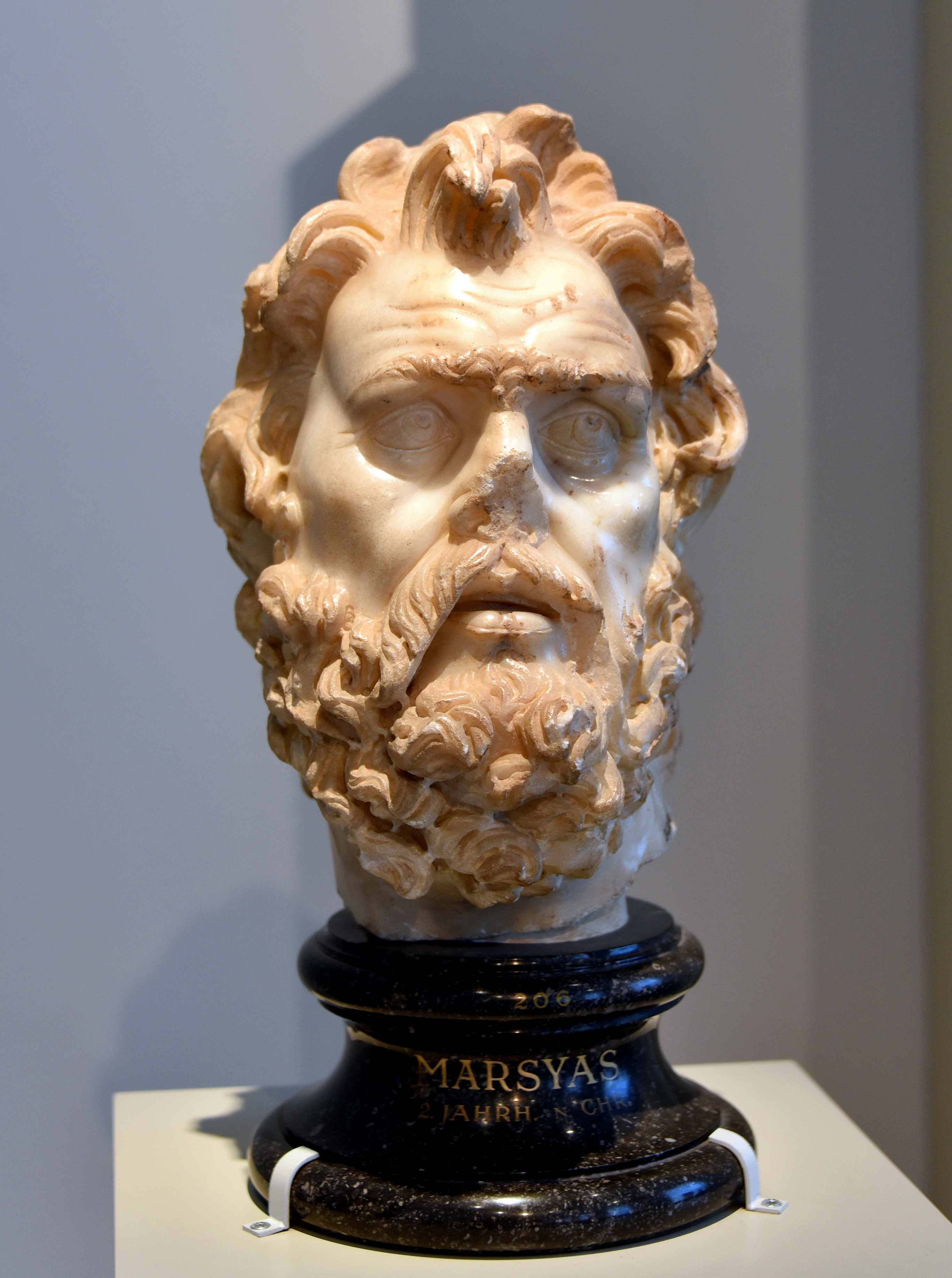 The head belongs to a statue from a group composition, which probably represented the musical contest between Apollo and the Silenus Marsyas. Marsyas' painted facial expression shows that he is starting to realize the full implication of his defeat and threatened punishment. From the Baths of Caracalla in Rome, Italy. Marble. Roman copy of an original one, 150-100 BCE. It is on display at the Altes Museum in Berlin, Germany.