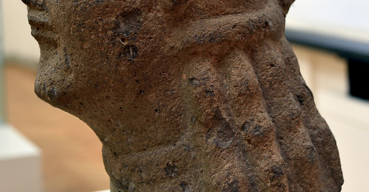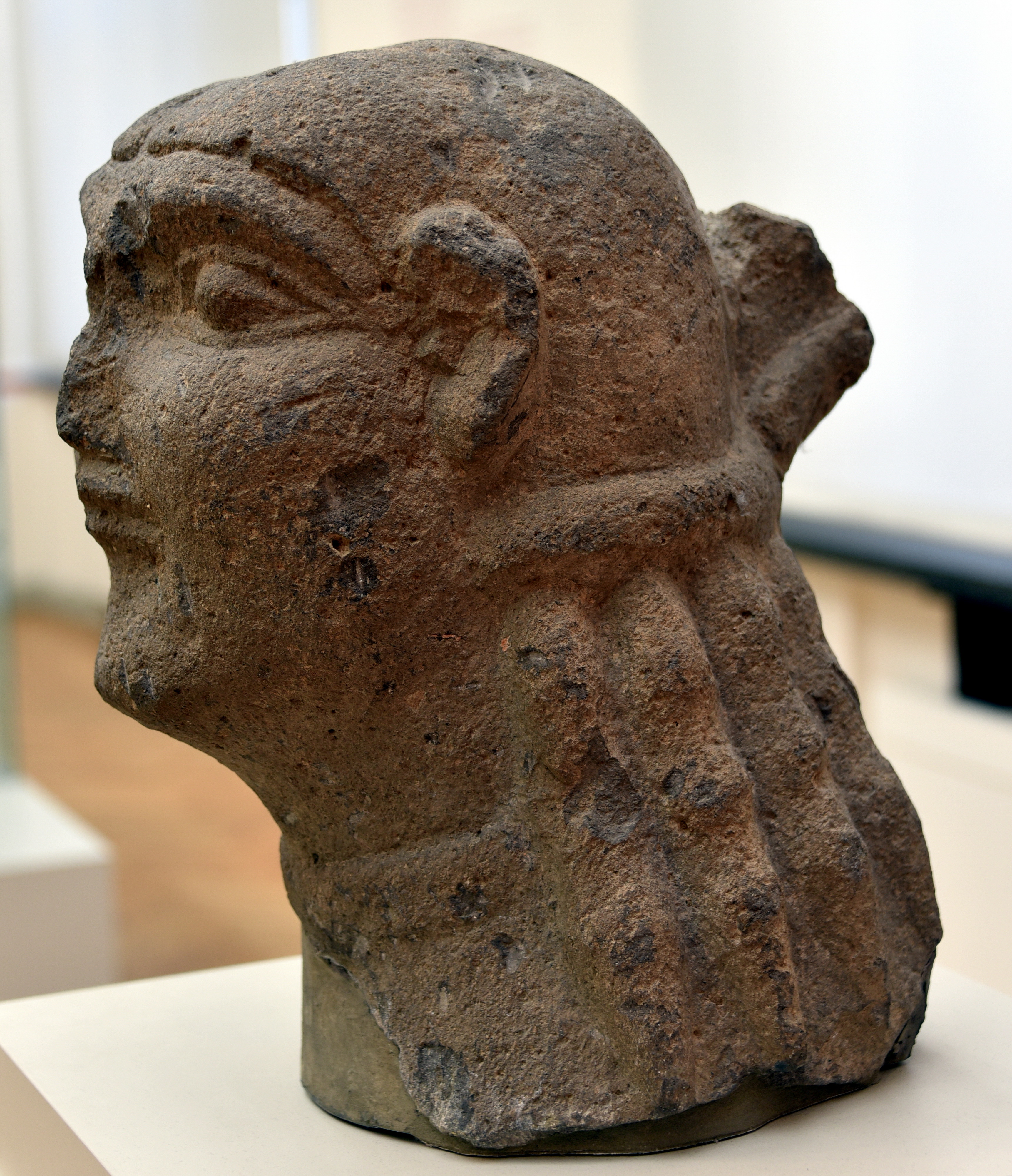 This head belonged to a crouching sphinx with a lion's body and wings. It stood wither on a tumulus or as a "sentinel" at the entrance to the grave. Nenfro (tuff). From Vulci, Italy. Circa 600 BCE. It is on display at the Altes Museum in Berlin, Germany.