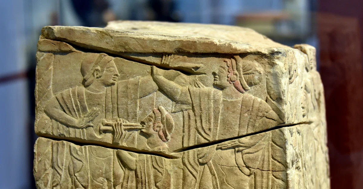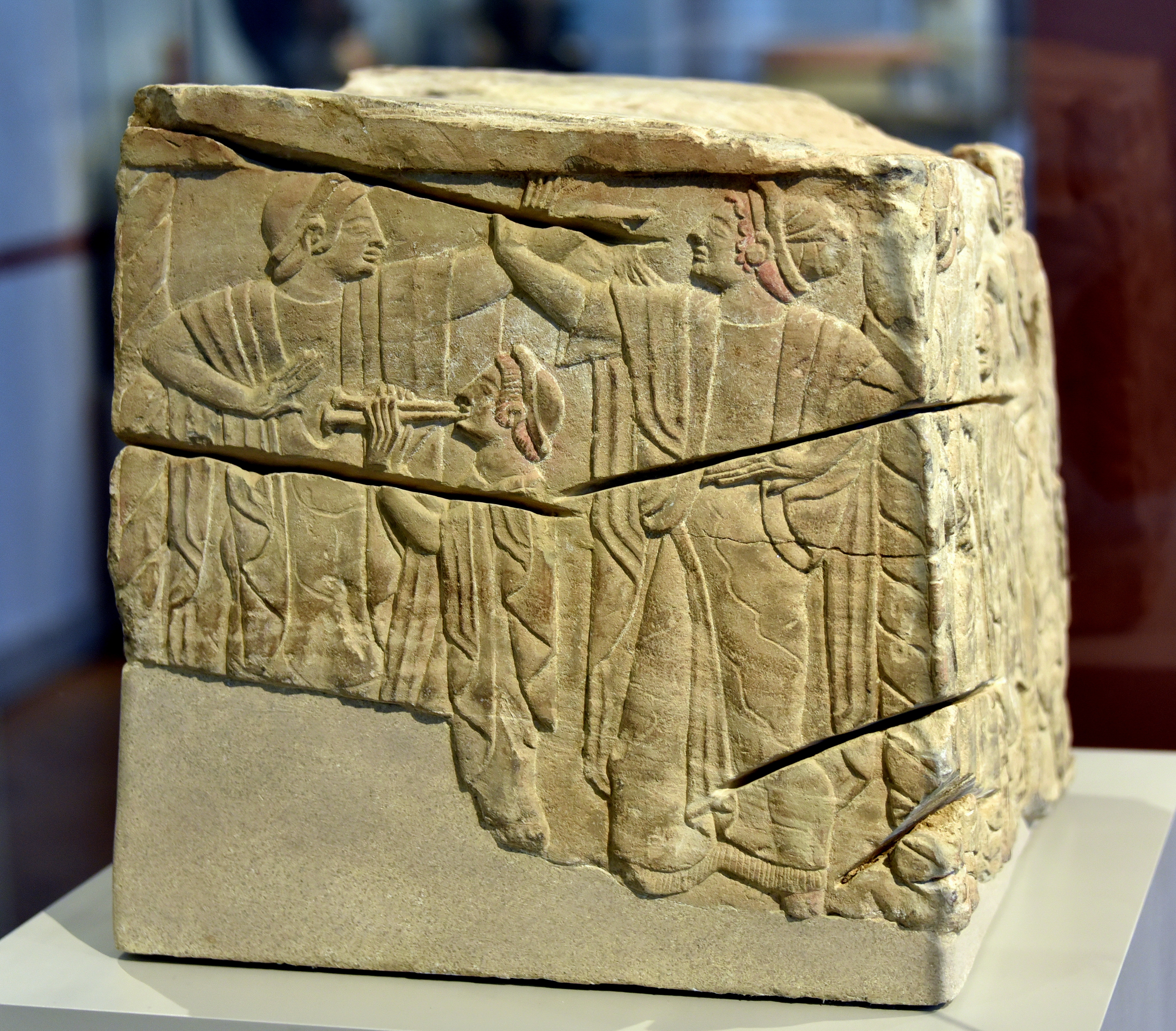 Square-shaped cippi were found inside burial chambers and carried an egg-shaped top, possibly as a symbol of life and fertility. The scenes depicted in bas-reliefs are connected with cult of the dead and burial, as are here the dances are in honor of the deceased. Limestone (pietra fetida). From Chiusi, Italy. Circa 500 BCE. Acquired from Collection Mazzetti (19th century). It is on display at the Altes Museum in Berlin, Germany.