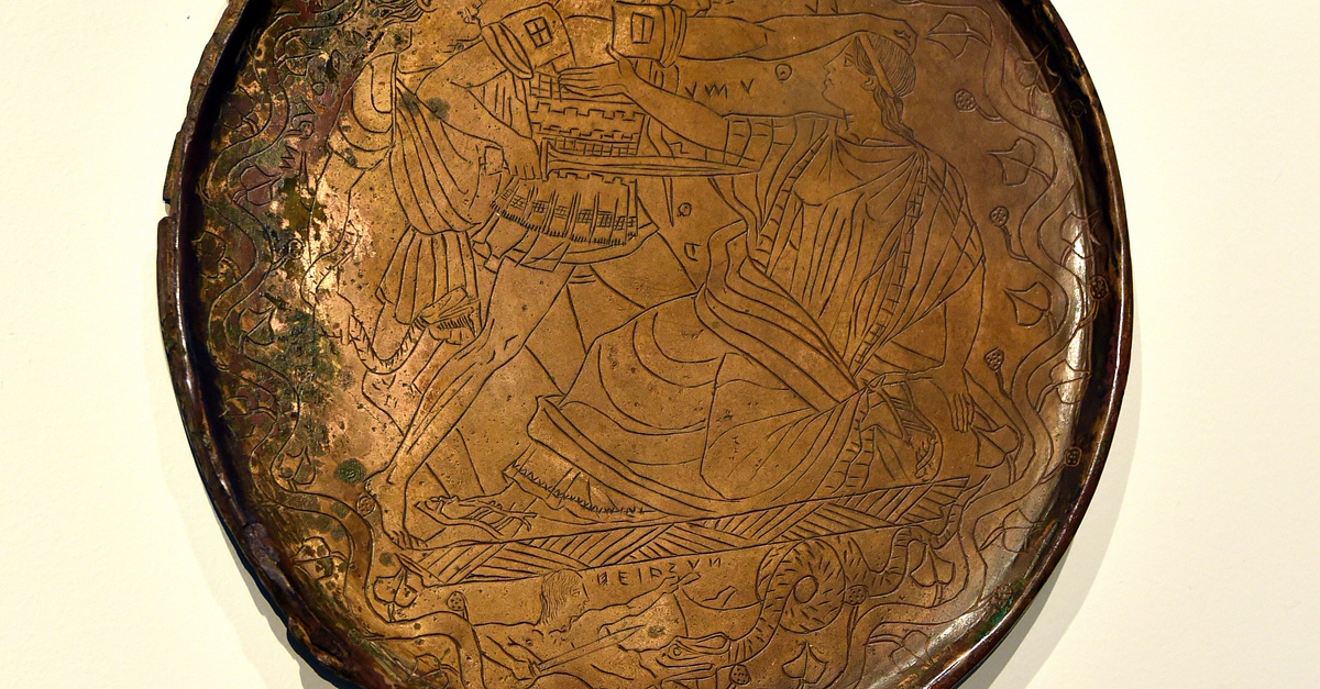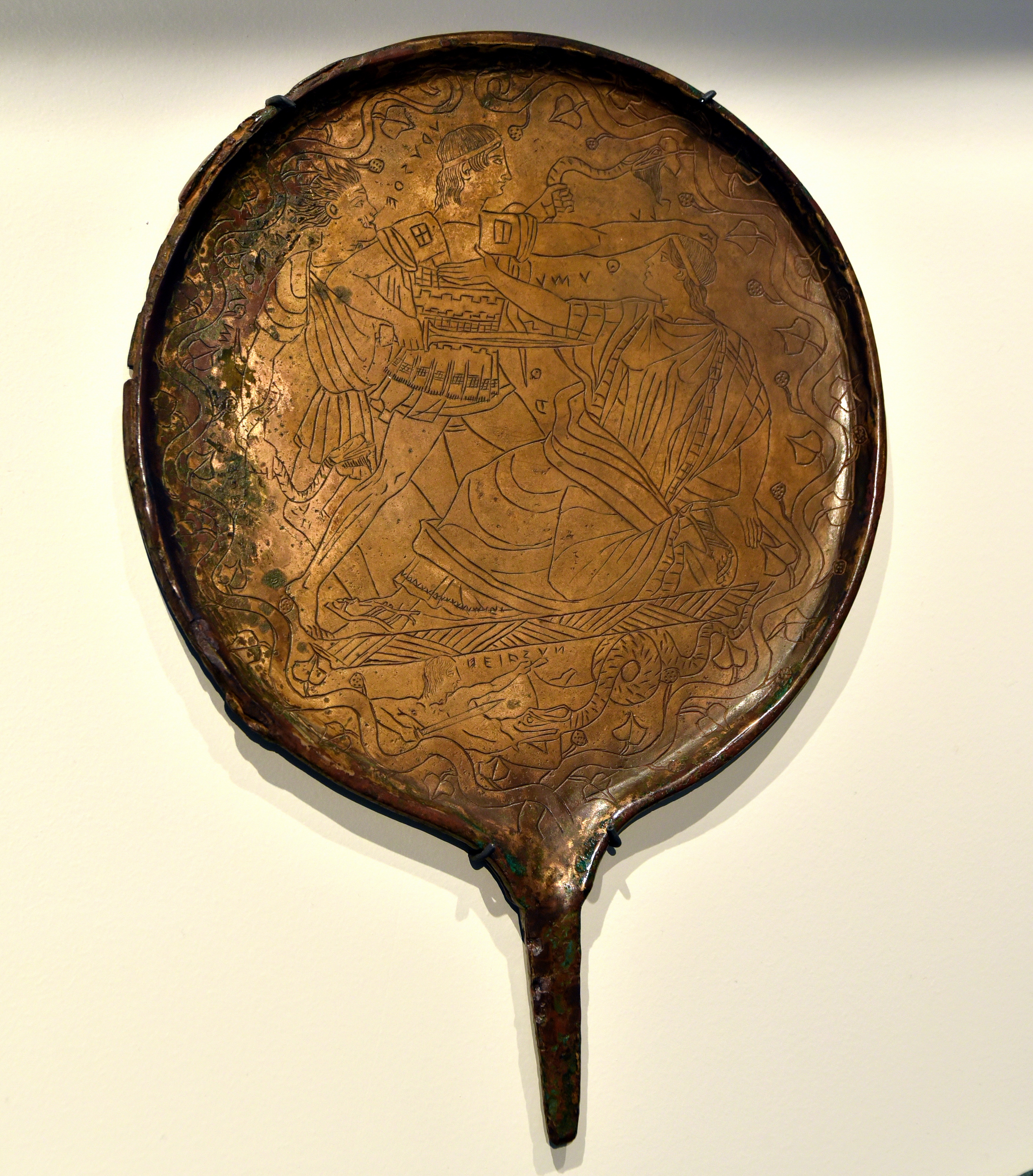 On this bronze mirror, a scene is carved. It depicts the killing of Clytemnestra by her son, Orestes. Engraved around 440 BCE. Acquired in 1843 CE. It is on display at the Altes Museum in Berlin, Germany.
