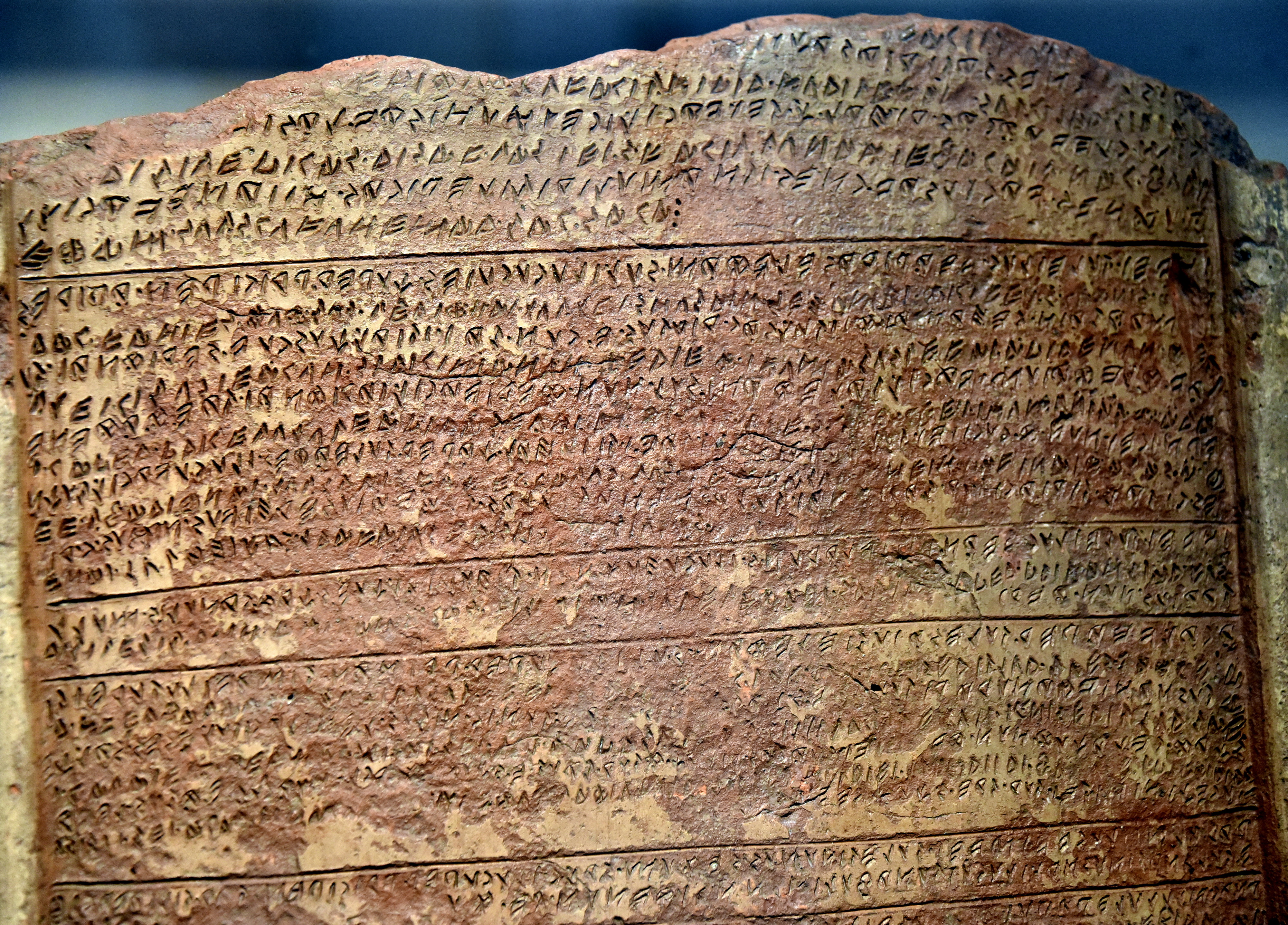 This is a detail of a large Etruscan ritual calander from Santa Maria Capua Vetere, Italy. The Etruscan language is preserved in about 10,000 short texts; the grave, votive, and ownership inscriptions. Only four longer texts are known so far, as this Capua clay tablet. However, the right-to-left script based on the Greek alphabet can be read but is difficult to translate. Clay. 5th century BCE. It is on display at the Altes Museum in Berlin, Germany.