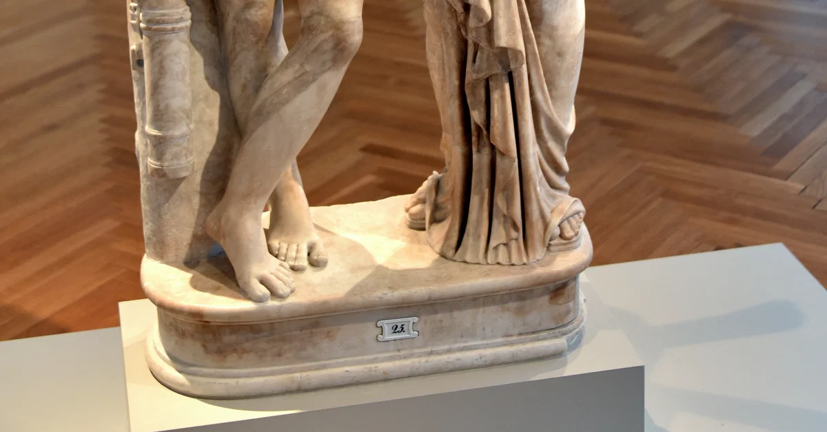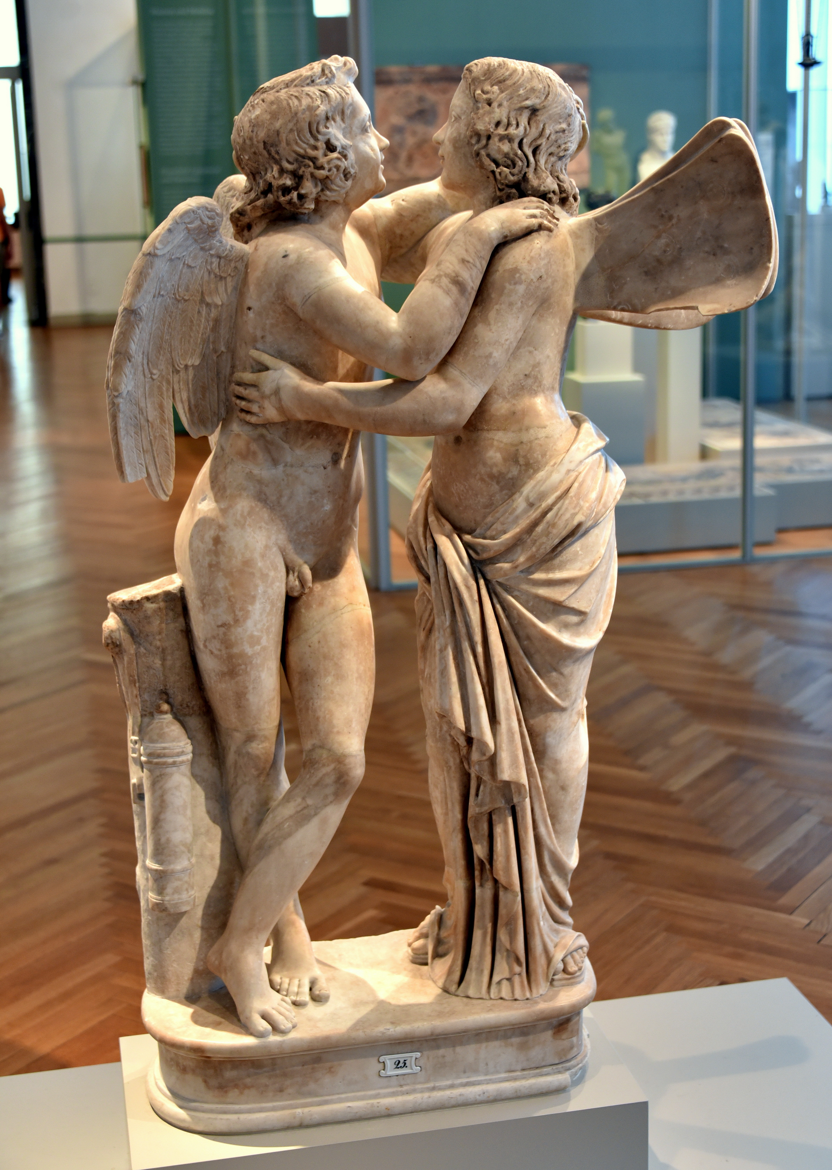 A marble statue of Amor and Psyche, the lovers from the late 2nd Century CE novel "The Golden Ass" by Lucius Apuleius (125 - 170 CE). The two are depicted as winged children embracing each other. The sculptural group was styled after a Hellenistic model either from the late 1st century BCE or from an early Roman imperial age. Marble. Roman copy, around 150 CE. From Collection Wilhelmine von Bayreuth, acquired in 1828-1830 CE. It is on display at the Altes Museum in Berlin, Germany.