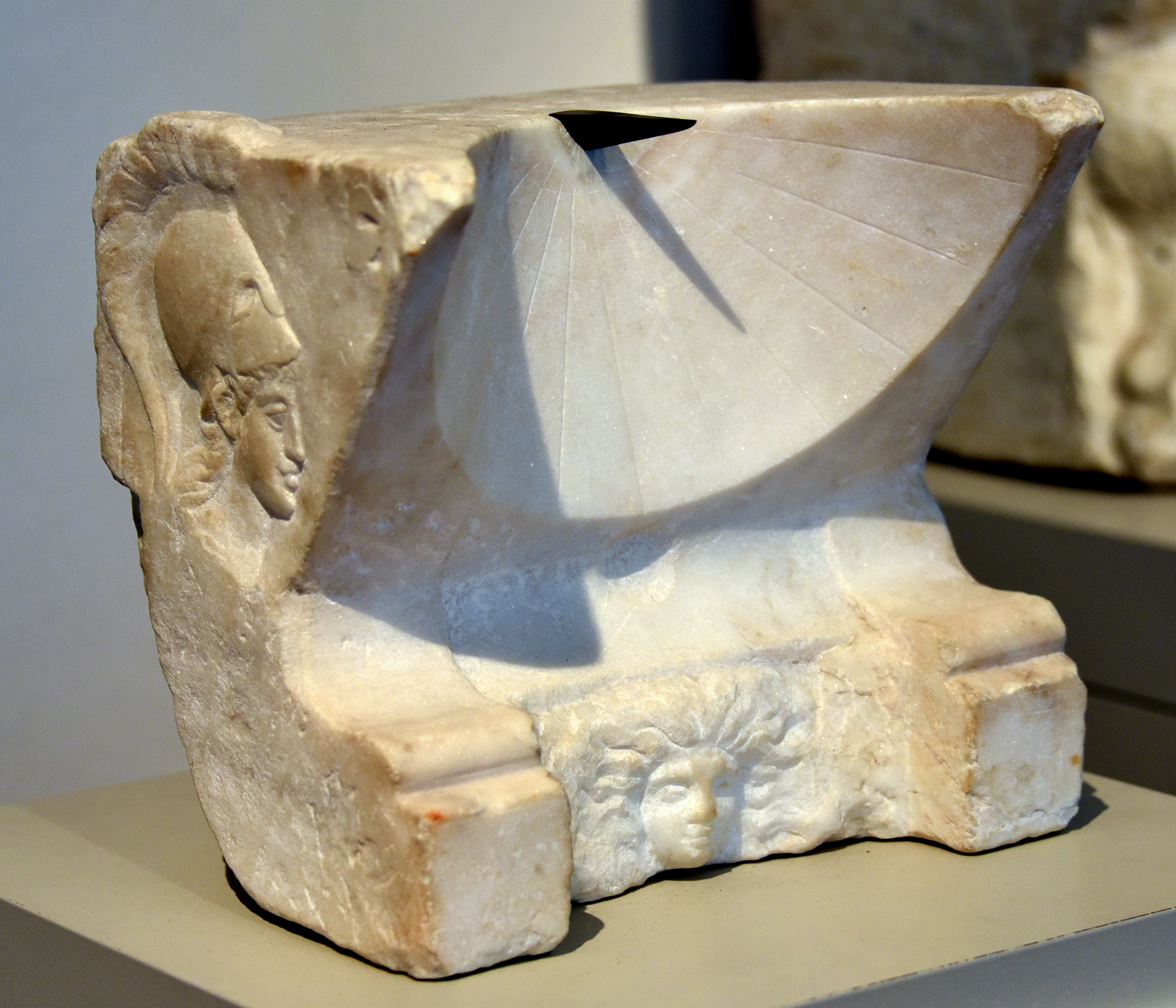 A 1st century CE sundial decorated with the likenesses of Helios, Dionysus, and Athena. Sundials were set up both in the public and in the private sphere in ancient Greece. The reconstructed indicator (gnomon) of the conical sundial is located in the projection of the vertical middle hour line (midday line). The time was read by the endpoint of the shadow cast by this indicator. Marble. From Athens, Greece; acquired in 1879 CE. It is on display at the Altes Museum in Berlin, Germany.