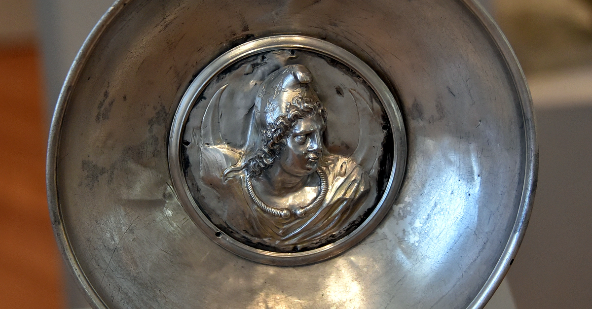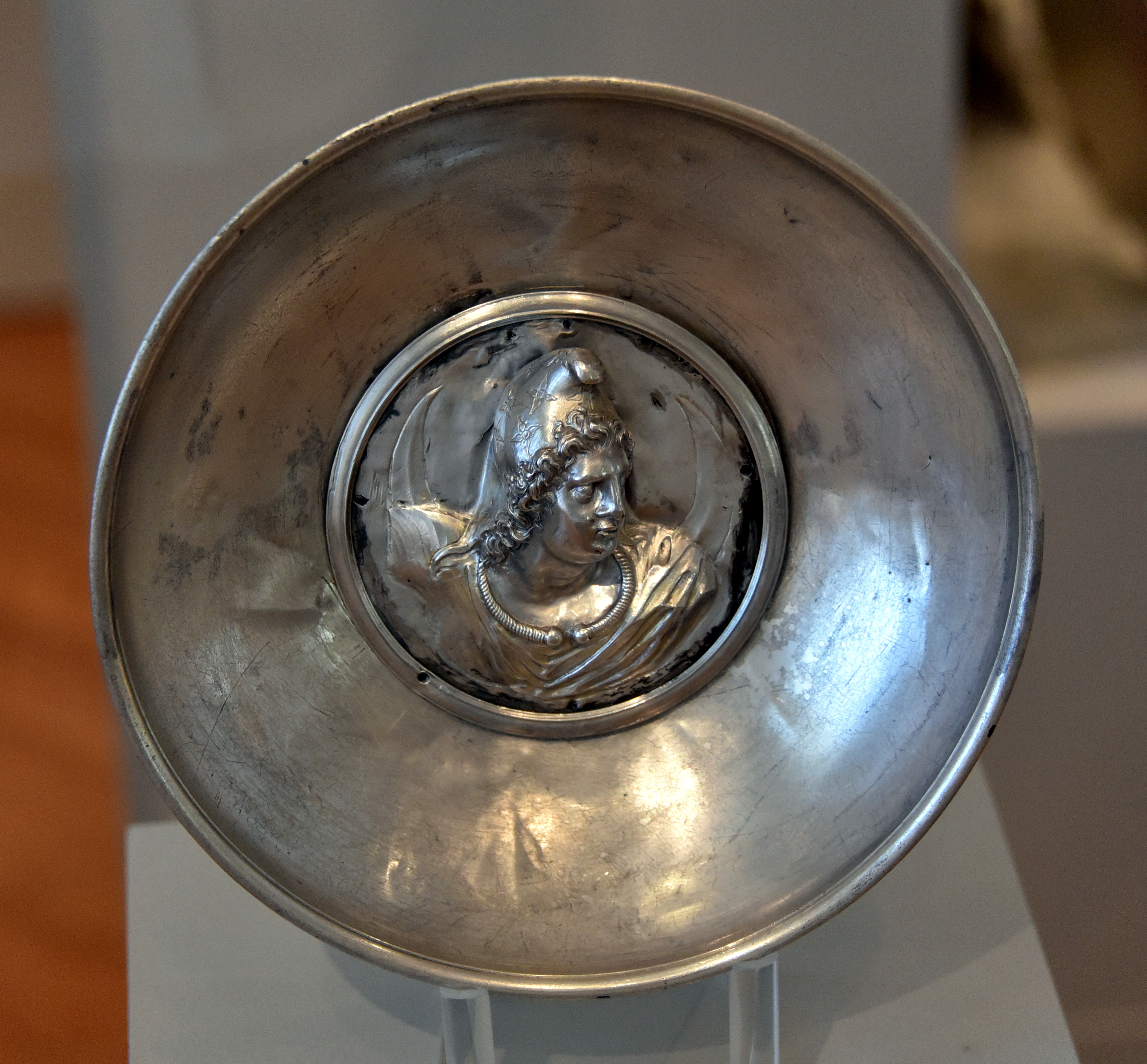 This bowl is part of the so-called "Hildesheim Treasure" and depicts a medallion of Attis. This relief probably had been originally attached to a piece of decorative armor as a military medal. The Hildesheim Treasure, consisting of more than 70 pieces, is one of the most substantial and qualitatively valuable treasure troves of antiquity. It represents a luxurious dinner service consisting of magnificent silver vessels, dining, and drinking tableware. Most certainly, this table service was produced in Italy. Silver, partly gilded, niello. Found 1868 CE in Hildesheim, Germany. 1st century BCE to 1st century CE. It is on display at the Altes Museum in Berlin, Germany.