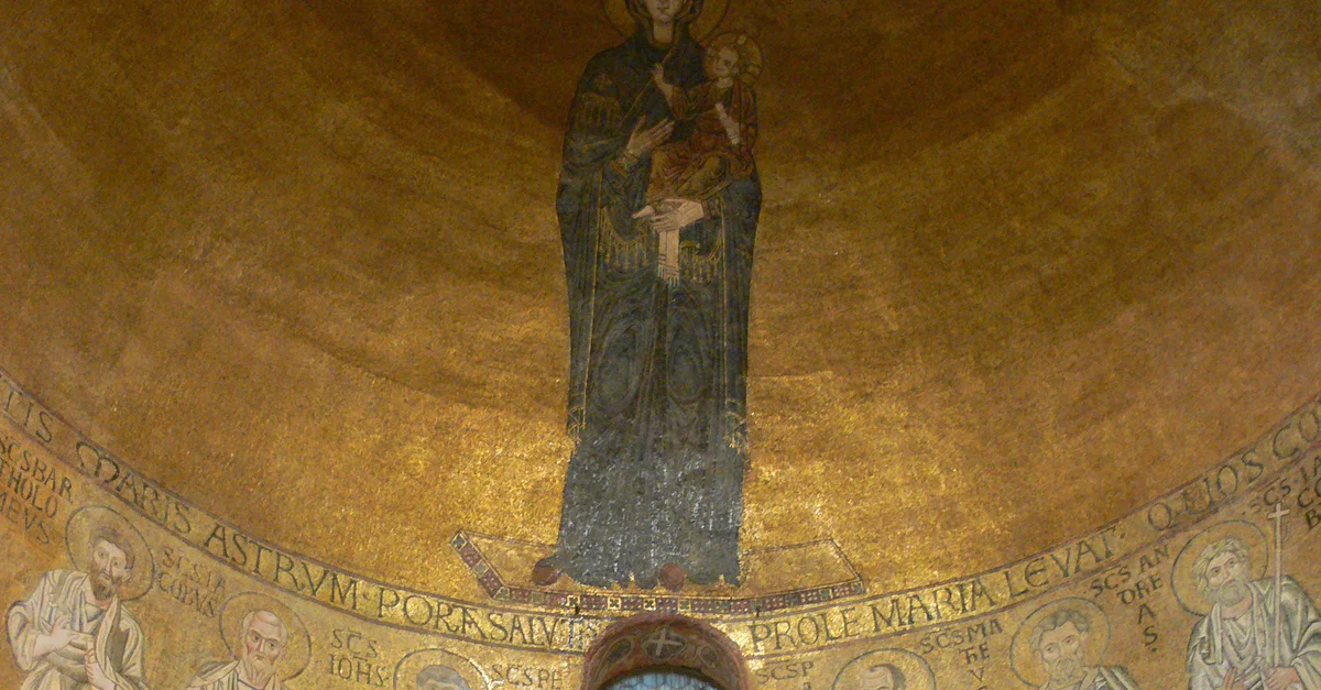 Main apse mosaic, Church of Santa Maria Assunta, Torcello. The Byzantine mosaic dates from the 11th century CE and depicts the Virgin Hodegetria.