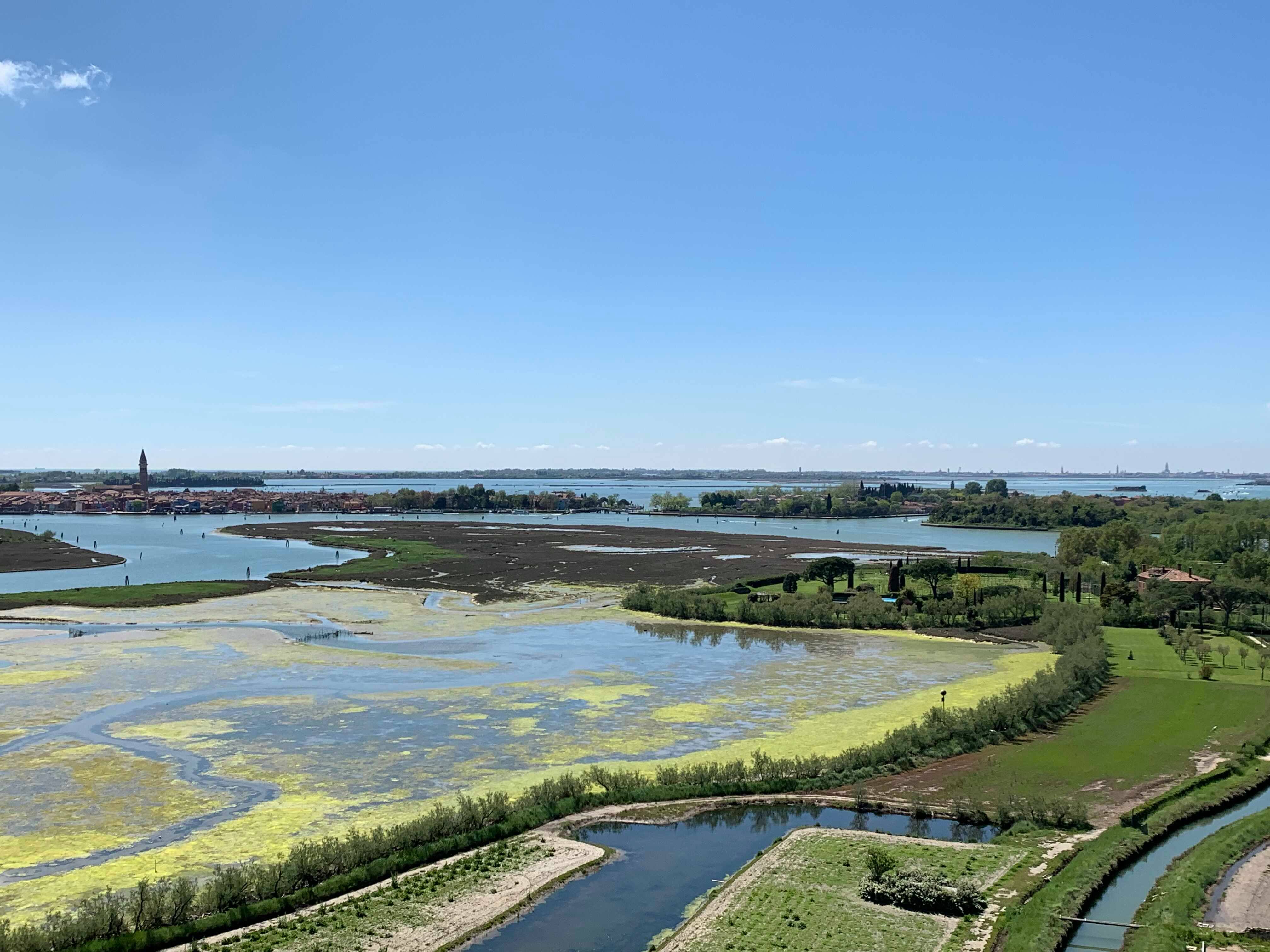 The Venetian Lagoon as seen from the bell tower at Torcello. Burano is seen on the neighboring island, while Venice can be glimpsed in the distance.
