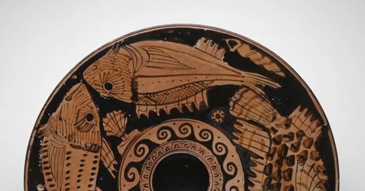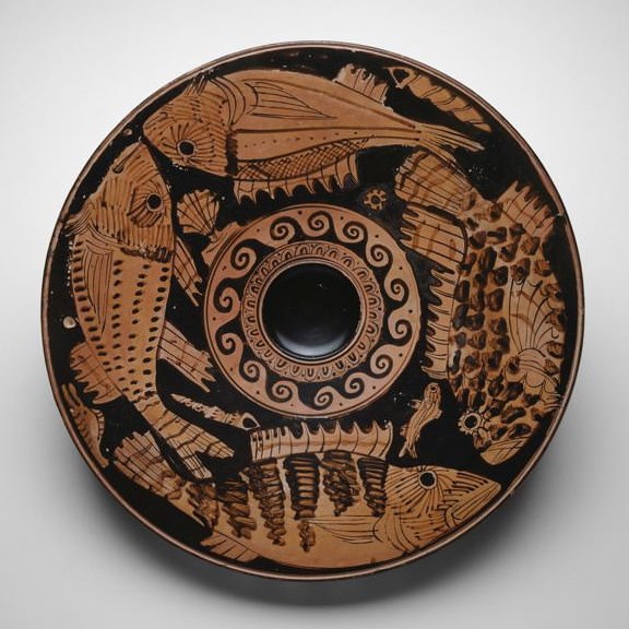 A Greek ceramic plate used for serving fish and seafood. A central depression collected any excess oil. The shape was popular in both Attica and Magna Graecia. Attic dishes almost always have the fish painted with their underside towards the outer edge whilst in southern Italy the underside of the fish was nearest the plate's centre. This example is from Attica, 400-350 BCE. (Art Institute of Chicago).