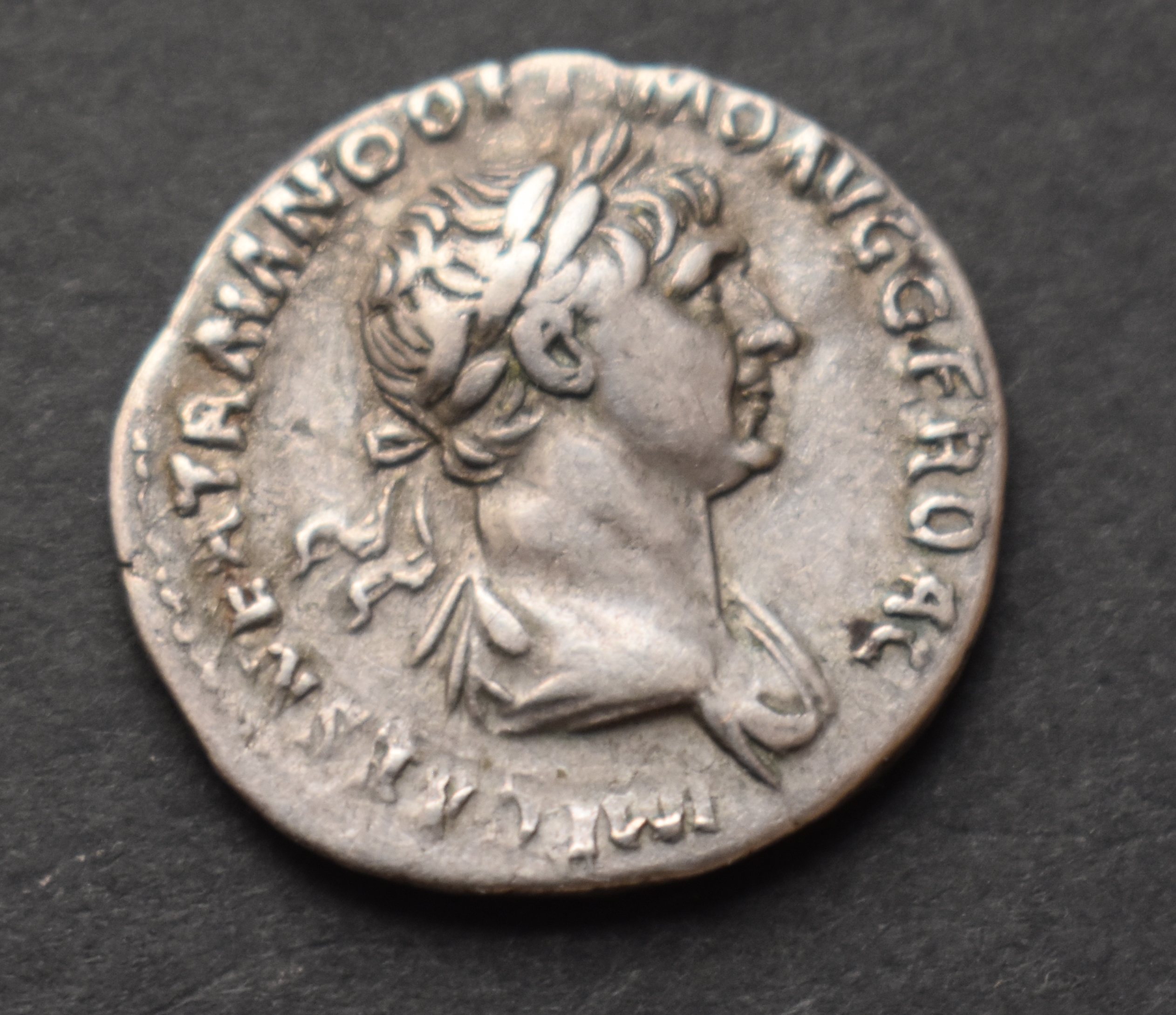 A silver denarius showing the face of Roman emperor Trajan (r. 98-117 CE)